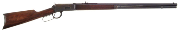 *WINCHESTER MODEL 94 LEVER ACTION RIFLE. Cal. 38-55. SN 898122. Standard grade rifle with 26” oct bbl, late markings, full magazine, standard front sight with screw & semi-buckhorn rear sight with patent date. Mounted with nicely figured, uncheckered, straight grain, American walnut with straight stock & crescent buttplate. CONDITION: Very fine. Bbl & magazine tube retain about all of their orig, bright, factory blue with a few scattered spots of light surface rust. Receiver is flaked, not worn, to about 65-70% strong orig blue with flaked areas a medium patina. There is a crack on left side of forearm, otherwise wood is sound with a series of small bruises on forearm & light handling & use marks. Forearm retains traces of orig finish, being mostly a hand worn patina. Buttstock retains about all of an unsanded, wiped-on finish. Mechanics are fine, brilliant shiny bore. 4-58884 (2,750-3,250)