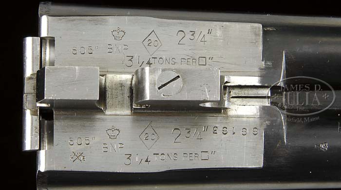 *COGSWELL & HARRISON 20 GAUGE “HUNTIC” SIDELOCK EJECTOR WITH CASE. SN 69163. Cal. 20 ga. 2-3/4″ Chambers. 28″ Dovetailed bbls with sunken game rib, engraved “Cogswell & Harrison Ltd. “HUNTIC” 168 Piccadilly, London, England.” are stamped with Birmingham nitro proofs on bbl flats. Bottoms of bbls are stamped “Made in England”. Case hardened bar sidelock action is stocked to the fences, and features automatic safety (SAFE inlaid in gold), and double triggers. Action and lockplates are engraved with well cut medium scroll at about 80% coverage. “Cogswell & Harrison Ltd” is engraved on each lockplate. Blued scroll engraved trigger guard has SN on grip. Nicely marbled European walnut straight grip buttstock measures 14-3/4″ over ribbed wood butt, and features drop points, flat topped traditional checkering with mullered borders, and a vacant gold oval on toe line. Splinter ejector forend has Anson release. Bore diameter: left-.612, right -.512. Bore restrictions: left -.010, right -.014. Wall thickness: left -.035, right -.033. Drop at heel: 2-1/8″, drop at comb: 1-5/16″. Weight: 5 lbs. 15 oz. LOP: 14-3/4″. Green canvas Emmebi case with leather trim is lined with green velvet. CONDITION: Excellent, essentially as new, showing little evidence of ever having been fired. There are some light marks on bbl and a few minor marks on buttstock. Bores are excellent, as are mechanics. 4-45066 MGM313 (4,000-6,000)