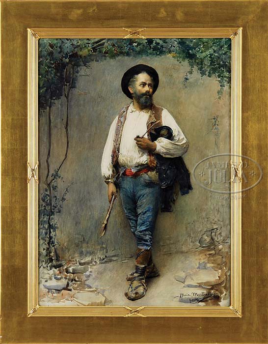 MARIA MARTINETTI (Italian, 1864- ) PEASANT WITH PIPE. Large fine watercolor portrait of a man with beard and tattered clothes standing against a stucco wall holding a pipe in one hand, a stick in the other. He holds his tattered blue jacket under his arm. Signed lower right “Maria Martinetti Roma”. Housed in its original gilt wood frame. SIZE: SIGHT SIZE: 29-1/2″ x 21-1/4″. CONDITION: Very good. 9-98378 (1,000-2,000)