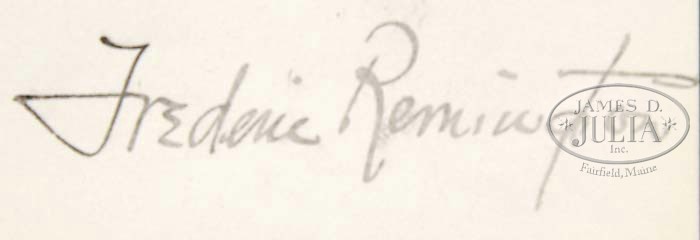 ARTHUR B. FROST (1851-1928) & FREDERIC REMINGTON (1861-1909) TWO BOOKS W/ SIGNATURES. 1) “Done in the Open” Drawings by Frederic Remington. Included is a 1-1/2″ x 3″ “Mr. Frederic Remington” name card with signature on reverse. 2) Book of drawings by A.B. Frost. Included is a 1-1/2 page 9-1/2″ x 6-1/4″ letter on blue stationary dated June 6, 1902 to a Mr. Coggeshall signed A.B. Frost. CONDITION: Autograph card & letter are very good. Books show some use but intact. The Remington book with loose binding. 9-23831 (500-1,000)