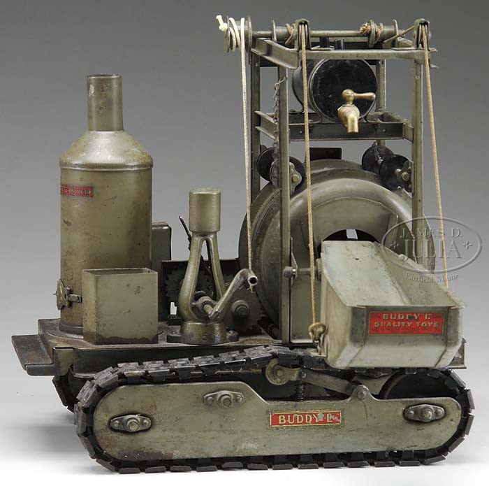 BUDDY L CEMENT MIXER ON TREADS. Fred Lundahl, founder of Buddy L, focused on play value of his toys that were manufactured. With this concrete mixer, made from 1929-1931, a young boy could actually make concrete and could build roads and foundations if he wanted to. These toys had a low survival rate as often times they were left outside. The operation of the toy was put in motion by turning the hand crank which turned gears with a clutch mechanism that could turn the drum and/or raise and lower the hopper. One the other side of the drum is the discharge chute that is controlled by a lever arrangement on the frame. With all the moving parts that had to be manufactured for this toy it is easy to see why there weren’t many made and certainly even less that survived. Finding the larger construction toys complete is a difficult task. This toy is all original and is in working condition. It was a very complex toy to engineer and produce. Buddy L also manufactured a smaller version of this toy without the treads. A very sought after toy that few collections have. SIZE: 15-3/4″ l x 16″ h. CONDITION: Overall very good plus. Has most of its original decals. As most of these toys that were heavily played with outdoors there is some surface rust to base of toy and general wear throughout. 1-11071 (2,500-3,500) Auction: Advertising, Toy & Doll - Spring 2011 Please Note: All prices include the hammer price plus the buyer’s premium, which is paid by the buyer as part of the purchase price. The prices noted here after the auction are considered unofficial and do not become official until after the 46th day. |