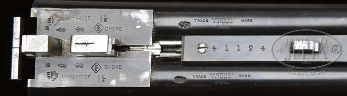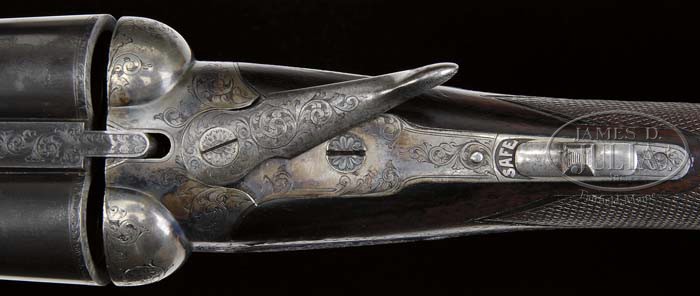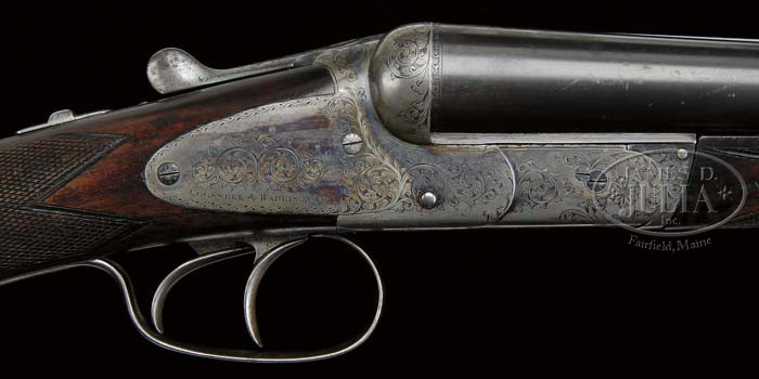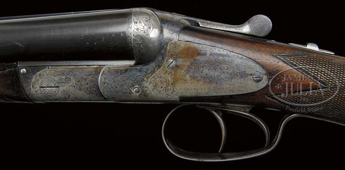 *COGSWELL AND HARRISON SANDHURST MODEL AVANT-TOUT GAME GUN WITH CASE. SN 41124. (ca 1907) Cal. 12 Ga. 2-3/4″ Chambers. 30″ Dovetailed bbls are engraved “Cogswell & Harrison Ltd THE AVANT TOUT 141 New Bond St. & 226 Strand. London.” on concave game rib with crossbolt extension. Bbl flats are stamped with London nitro proofs for 1-1/8 oz shot. Bottoms of bbls are stamped with “Archus” trademarks and are fitted with patented avant-tout ejector mechanism. SN is on ejector housing. Case hardened side-plated boxlock action features automatic safety (SAFE relief engraved), crossbolt type third fastener, and double triggers. Action and side-plates are engraved with very nicely cut large open shaded scroll with about 60% coverage. “Cogswell & Harrison Ltd” is on each sideplate. Scroll engraved trigger guard has SN on tang. Nicely streaked and figured European walnut straight grip buttstock with 20 LPI flat top point pattern checkering with mullered borders measures 14-1/2″ over ribbed wood butt on 5/8″ lengthening piece. Matching splinter forend has steel tip and spring detent release. Bore diameter: left -.729, right -.729. Bore restrictions: left -.010, right -.006. Wall thickness: left -.032, right -.031. Drop at heel: 2-1/4″, drop at comb: 1-1/2″. Weight: 6 lbs. 12 oz, LOP 14-1/2″. Old, probably original, leather case with brass corners is embossed “C.H.” on lid. Interior is lined in reddish cloth, and contains 2-pc brass and ebony cleaning rod, C & H marked round pewter oil bottle, 4″ long tubular brass oil bottle, old pull-through cleaning brush, assorted brushes and mops, and case straps. CONDITION: Very fine, as found. Bbls retain 90% + orig blue with some areas of discoloration, mostly on top rib. Action retains about 60% orig case hardening color, silvered on fences and bottom of action. Top lever is flaked to mottled silver. Trigger guard retains 50% of its orig bright blue. Stocks retain most of what appears to be their orig finish with many minor marks from normal use. Checkering is slightly worn and missing one or two diamonds. Bores are very fine, bright and shiny with some slight frosting toward breech end of right bbl. Action is tight. Bbls are on face. Ejectors are slightly out of time. Case leather is very dry with top grain crazed and flaking off. Needs stabilization. Interior cloth shows areas of fading, and moth damage. Partitions are tight. Accessories are fine. Straps and handle need attention. A solid, high quality, work horse. 4-41951 MGM53 (1,750-2,750)