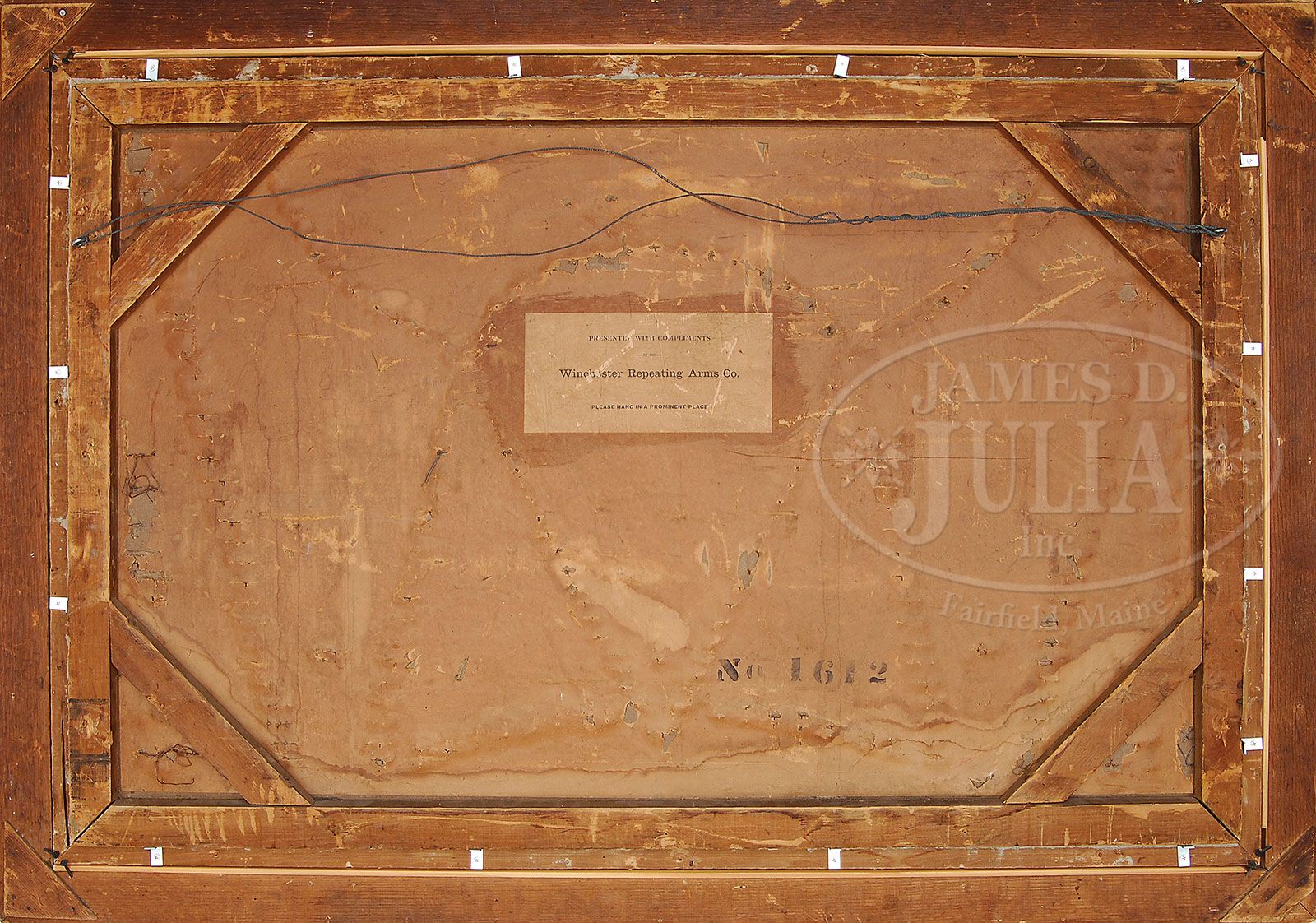 SCARCE WINCHESTER MODEL 1897 DOUBLE-W CARTRIDGE BOARD. SN 1612. Scarce board containing 182 cartridges plus a variety of paper and brass shot shells, grooved and paper patched bullets, percussion cap tins and primers mounted on its orig green cardboard backing with 49″ X 37-1/2″ exposed image in its orig gold gesso inside frame which is mounted in a 2-3/4″ wide, flat oak frame. Bottom center of the frame is hand painted “TENK HARDWARD CO”. Top center of the board has the “WINCHESTER” red letter logo over “REPEATING ARMS CO”. Centered on the board is the A.B. Frost vignette of two early hunters and their Winchester rifles with a dead bear. Left center of the board is a flying mallard drake and right center is a bull moose head. Back of the board has its orig paper covering with the stenciled number “1612” and the orig display instructions label. It appears that about 5 of the cartridges have been reattached and that 3 or 4 cartridges are missing their bullets. All cartridges appear to be orig board dummies. This may be the highest numbered board known. CONDITION: Very good. The backing board retains most of its orig dark green color with a few spots of touch up, not affecting the images. The red lettering is mostly faded to a pale red. The center vignette is moderately to heavily faded but still retains sharp images. Cartridges are lightly to moderately oxidized with paper patches yellowed with some flaking. Paper shot shells are dark with some wear and light damage on the window shells. Interior gold frame has a few spots of touch up otherwise is fine. Outside frame has a couple of grain checks and shows wear & light soil. Backing paper is dark and yellowed but mostly intact. 4-47096 JR375 (12,500-17,500)