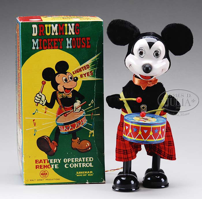 BATTERY OPERATED DRUMMING MICKEY MOUSE IN ORIGINAL BOX. Linemar, Japan. Exceptional large Disney character walks forward with lit eyes and drumming action. Felt clothing over tin body. Popular remote control toy with vibrant images of Mickey on all six sides of box. SIZE: 11″ t. CONDITION: Very good to near excellent and working. Box is very good. 1-9276 (700-900) Auction: Advertising, Toy & Doll - Spring 2009 Please Note: All prices include the hammer price plus the buyer’s premium, which is paid by the buyer as part of the purchase price. The prices noted here after the auction are considered unofficial and do not become official until after the 46th day. |