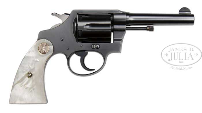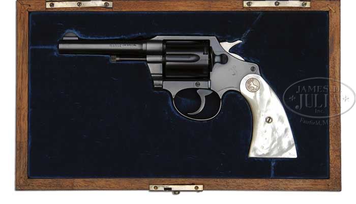 *RARE AND HISTORIC CASED J. EDGAR HOOVER PRESENTATION COLT POLICE POSITIVE DA REVOLVER. SN 411713. Cal. 38 Spcl. Blue finish with 4″ bbl, integral half moon front sight and grooved rear in top strap. Bbl has usual 2-line address on top with model & caliber marking on left side. Sideplate is marked with the rampant Colt and revolver is mounted with smooth 2-pc rampant Colt silver medallion grips. Accompanied by a custom mahogany casing with inlaid light colored wood line inlaid in the top. Box is lined in blue velvet and inside the lid is affixed a 3-1/4″ x 1-3/4″ silver plaque inscribed “PRESENTED TO / JOHN EDGAR HOOVER / DIRECTOR OF INVESTIGATION / U.S. DEPARTMENT OF JUSTICE / AUGUST 10-1933 / AS A TOKEN OF THE AFFECTION / AND ESTEEM OF HIS ASSOCIATES”. This date coincides with the Bureau of Investigation being officially renamed the Division of Investigation with Hoover named as Director. At a time when law enforcement was becoming more professional, Hoover continued his campaign to create a modern, professional force that combined scientific methods with advanced police skills.Additionally accompanied by a Colt factory letter identifying this revolver as found in 38 caliber with 4″ bbl, blue finish & pearl grips shipped to Joseph A. Lorch/Washington D.C. on August 9, 1933 in a 1-gun shipment. Lorch was Colt’s D.C. area sales manager and handled many important Government consignments. Also accompanying is a copy of a 3-page hand written letter over the signature of John P. Mohr wherein he identifies this revolver, by SN and description and states that he personally witnessed this revolver in Mr. Hoover’s home and possession and that upon Mr. Hoover’s death, the heir to Mr. Hoover’s estate was Clyde A. Tolson, the former Associate Director of the FBI and Mr. Mohr’s superior. Mr. Mohr states that Mr. Tolson did not wish to have firearms in the house so he gave them directly to Mr. Mohr who was Assistant to the Director of the FBI and is the consignor’s late Father-in-Law. Mr. Hoover, over his career, was the recipient of numerous gifts & favors with several firearms having surfaced in the ensuing years since his demise that have been linked directly to him. J. Edgar Hoover (1895-1972) was instrumental in forming the Bureau of Investigation, the predecessor to the FBI and was its director from 1924 to 1935 when the Federal Bureau of Investigation (FBI) was formed and he became its first director in which office he remained until his death in 1972. Mr. Hoover was instrumental in establishing the FBI Crime Laboratory in 1932 and was the moving force behind organized crime fighting in the 1930s which was his lifelong passion. There is no indication of what event prompted the presentation of this revolver but it must have been significant to warrant such a presentation during the austere times of the Great Depression. PROVENANCE: J. Edgar Hoover; Clyde A. Tolson; John P. Mohr; Consignor. CONDITION: Extremely fine plus, appears to be unfired. Overall retains all of its crisp orig factory finish with only a very faint hint of a cyl indexing line. Grips are crisp with sharp edges and retain great fire & color. Box has a grain check in the lid, otherwise is sound with lightly soiled lining that has small damage from the hammer spur. 4-42244 JR98 (10,000-20,000)