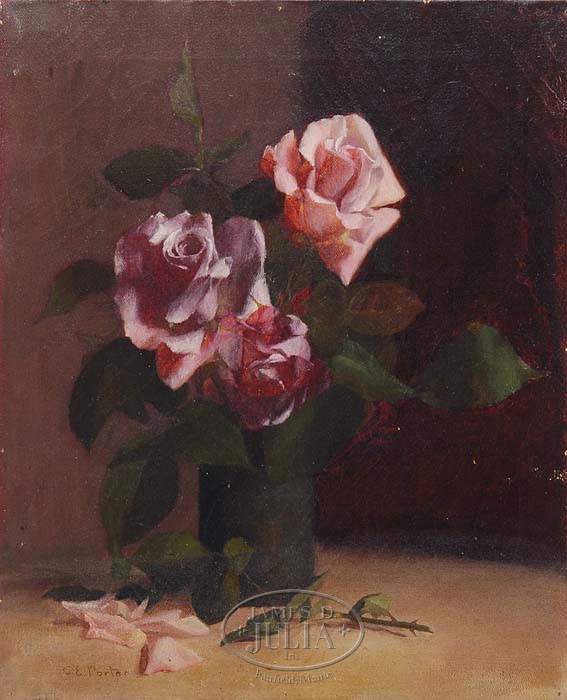 CHARLES ETHAN PORTER (American, 1847-1923) PINK ROSES. Unframed oil on canvas still life scene shows a green vase of three pink roses and green leaves. One rose has dropped to the tabletop and the petals are separated. Signed lower left “C E Porter”. SIZE: 15-1/4″ x 12-1/2″. CONDITION: Very good. 9-95553 (5,000-7,000)
