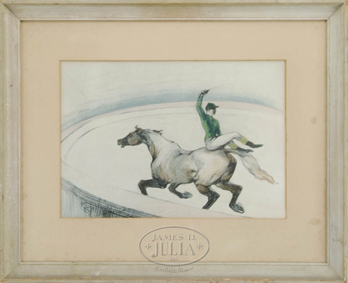 HENRI DE TOULOUSE LAUTREC (French, 1864-1901) CIRCUS RIDER. Lithograph shows a man riding on the back end of a horse backwards. He wears a green shirt and cap and holds a whip in the air. Signed with artist monogram in the print. Housed in an old washed molded wood frame with off color matte. We are not sure of the vintage or series that this print is part of. SIGHT SIZE: 11-1/2” x 16-1/2”. CONDITION: Good. 9-29296 (200-400)
