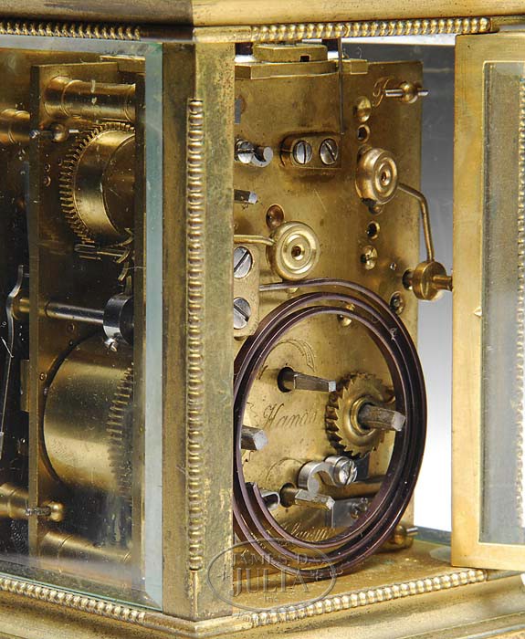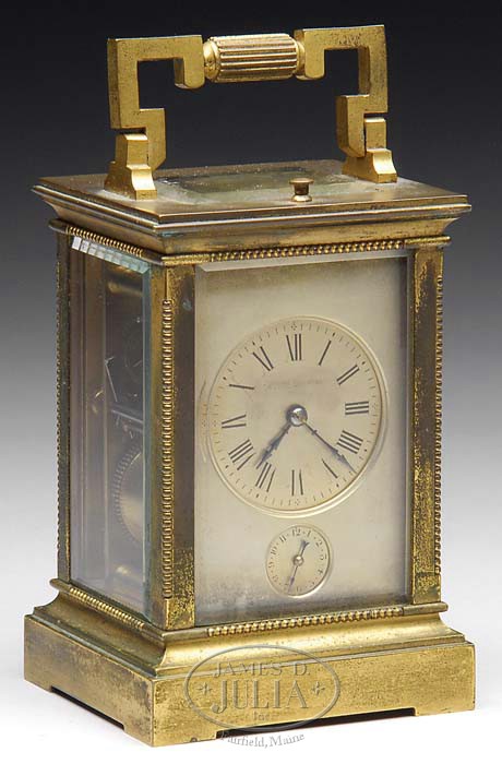 FRENCH BRASS REPEATING CARRIAGE CLOCK WITH ALARM. Late 19th/early 20th Century. Probably Lewis Fernier. The brass case with beaded edge and carrying handle, raised on a molded base with bracket feet and fitted with beveled glass panels on all sides having a silvered dial with Roman Numeral chapter ring, above a subsidiary alarm dial. The brass movement with twin barrel movement and single striking coil with two hammers, the backplate engraved “LF” with the serial number “1493”. SIZE: 6-1/4″ overall h x 3″ w x 2-3.4: d. CONDITION: Case very good overall, works in need of cleaning and repair. 9-95742 (600-900)