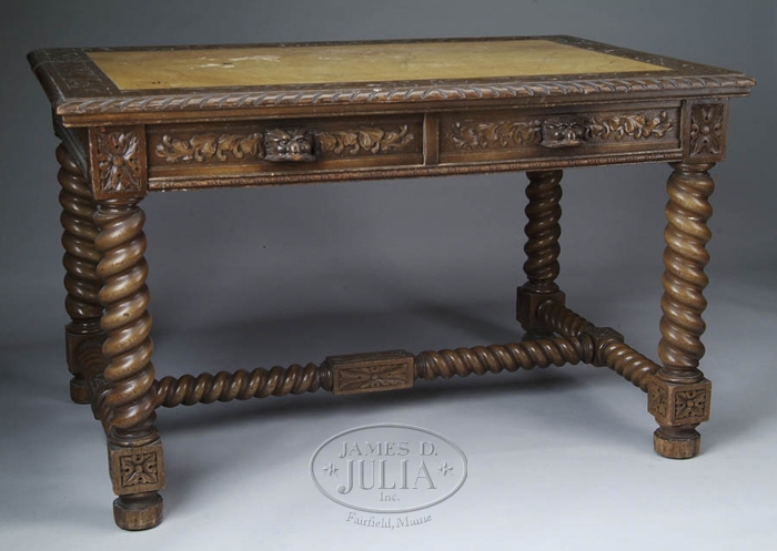 LAVISHLY CARVED JACOBIAN STYLE TWO DRAWER DESK OR LIBRARY TABLE. Rectangular top having a gadrooned carved edge and faux painted marble insert with a carved scroll and leaf border. Frieze has all over leaf carving and has two side by side drawers with lion head handles. All supported by four large spiral carved legs ending in carved blocks with turned feet. A large H-stretcher with spiral carving and carved blocks finishes the table. Piece finished in a dark medium color and is oak. SIZE: 29-1/2” h x 48” w x 32” d. CONDITION: Some scarring to top surface, otherwise good. 9-28874 (700-1000)
