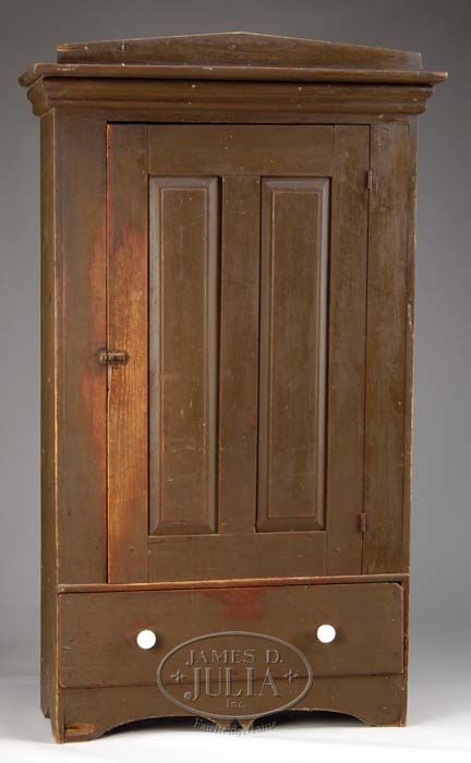 AMERICAN PINE ONE DOOR KAS IN ORIGINAL BROWN PAINT, CIRCA 1870. The rectangular molded cornice with architectural crest above the conforming case fitted with single fielded panel covered door opening to an interior of three fixed shelves above a long drawer over a shaped apron, the case with bootjack ends. PROVENANCE: Purported by owners to be of Wisconsin origin, made by German immigrants. SIZE 76-3/4” h x 45” w x 17-1/2” d. CONDITION: Very good. Retains old red/brown surface structurally all original. Minor damages around base. 9-74857 MD (4,000-6,000)