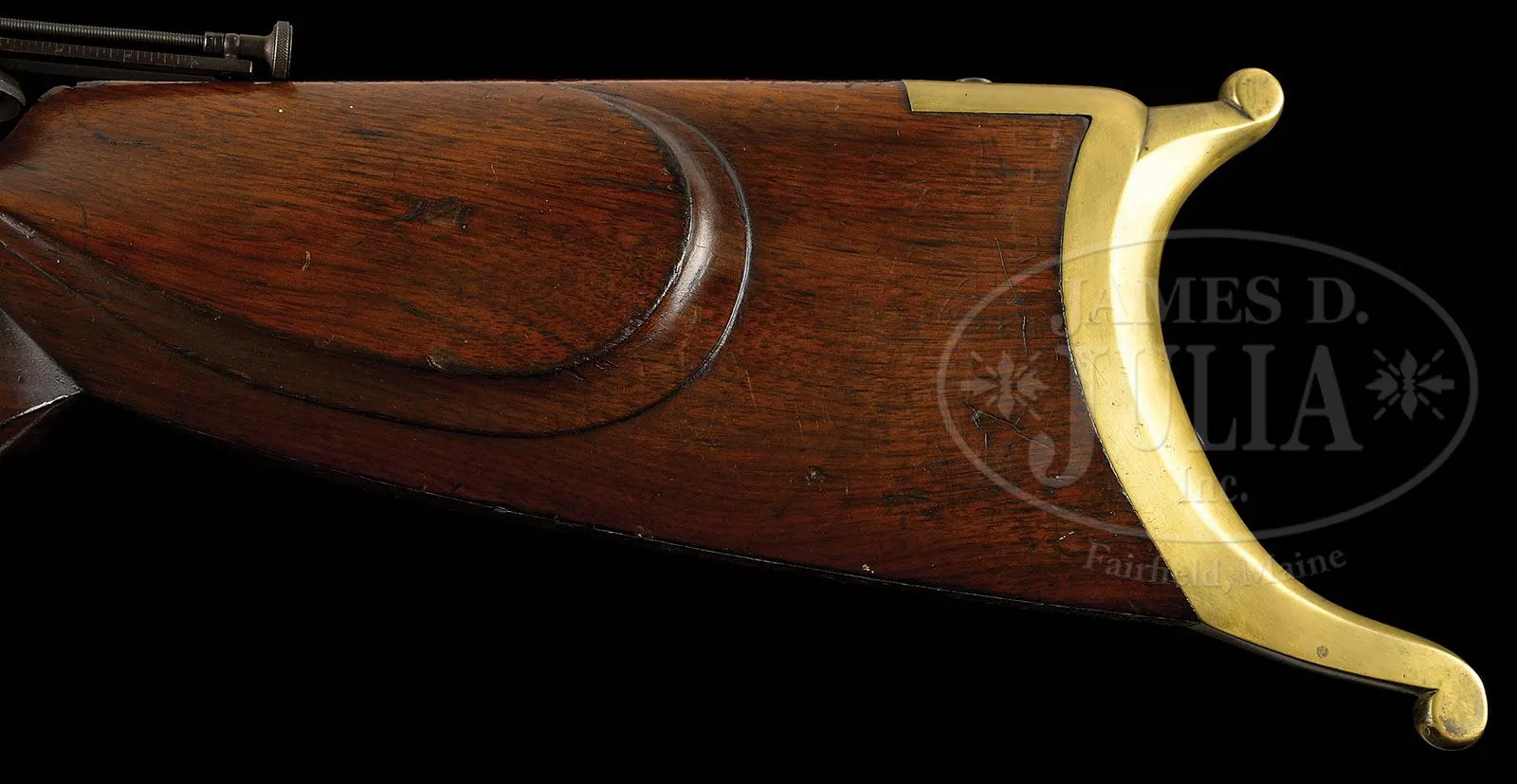 RARE SHARPS MODEL 1874 NY SCHUETZEN CORPS RIFLE. SN 162223. Cal. 40-50 Sharps Bottleneck 1-11/16″. Very rare Sharps “German Pattern” target rifle also known as Schuetzen rifle, with 30″ oct bbl, very early globe front sight with pin, replacement Sharps-style 800 yd ladder rear sight and it’s orig vernier tang sight with 4″ staff. Top flat of bbl has the “Old Reliable” cartouche & Bridgeport address with caliber marking over the chamber area and case length on the right side flat. Mounted with extremely rare, uncheckered, straight grain American walnut buttstock that has pistol grip, slight perch belly and a shallow cheek piece with a brass sporting buttplate. Right side of buttstock has an empty 1-3/4″ by 7/8″ oval silver name plate. Just behind this inlay are the hand stamped initials “F.L”. Forearm appears to be a special order treatment among the group purchased by the New York Scheutzen Rifle Club. Bottom of the forearm has a threaded socket for a palm rest with an identical threaded hole in the front part of the lever. Bottom of the bbl has an extra threaded hole that is just covered by the tip of the forearm. All of the parts examined are matching numbered including receiver, bbl, lockplate, trigger plate & buttstock. Buttplate & forearm are unnumbered. Accompanied by a Sharps Factory Records letter from Dr. Richard J. Labowskie, current owner of the records, wherein he states Order Book #6 lists this rifle as a Model 1874 Schuetzen invoiced at Bridgeport Jan. 17, 1878 to William Gennerich, Secretary of the NY Central Schuetzen Corps, New York City. It is described as being 40-50 cal., 1-11/16″ with 30″ oct bbl, globe front sight, mid-range vernier tang sight mounted on a sporting base, stocked with cheek piece & sporting buttplate. Letter continues that the order was for 18 identical Schuetzen rifles shipped on the same date. Paragraph 3 of the letter states that a total of 69 Model 1874 Schuetzen rifles were produced, 68 of which were sent to the New York Central Schuetzen Corps between Jan and May 1878. The 69th rifle was sent to Edwin S. Harris, New York City. The New York Schuetzen Corps was founded in 1857 by German immigrants and it continues in business today. Occasionally one of these 69 rifles will surface and are usually found with various individual modifications to suit the owner at the time. Most of them have at least one or more minor modifications. CONDITION: Fine, all matching except forearm and buttplate which are unnumbered. Bbl retains 80-85% orig blue, turned a little dull with the balance a brown patina. Receiver, lockplate & trigger plate retain strong case colors, turned a little dark. Wood is sound with the aforementioned palm rest socket in the forearm, 2-3 bruises on the buttstock with nicks & scratches in the finish and overall retains about 90% orig factory varnish. Forearm retains 96-98% orig varnish. Mechanics are fine. Bright, shiny bore. 4-48711 JR268 (5,500-8,500)