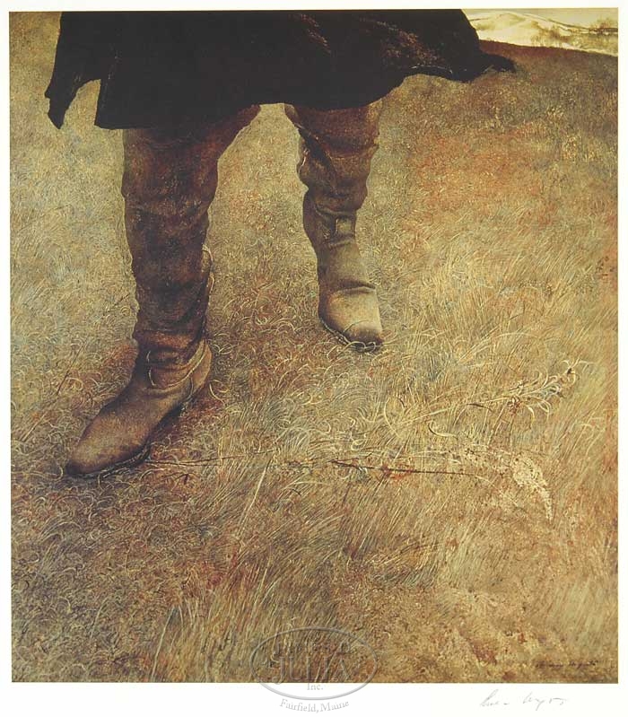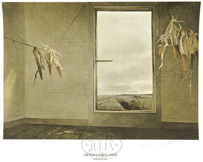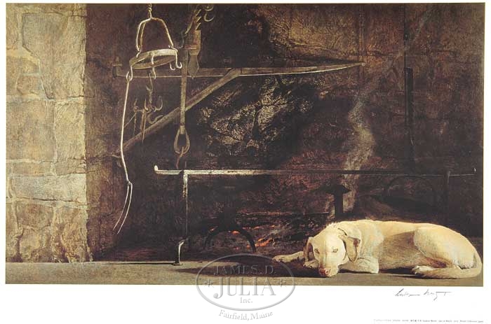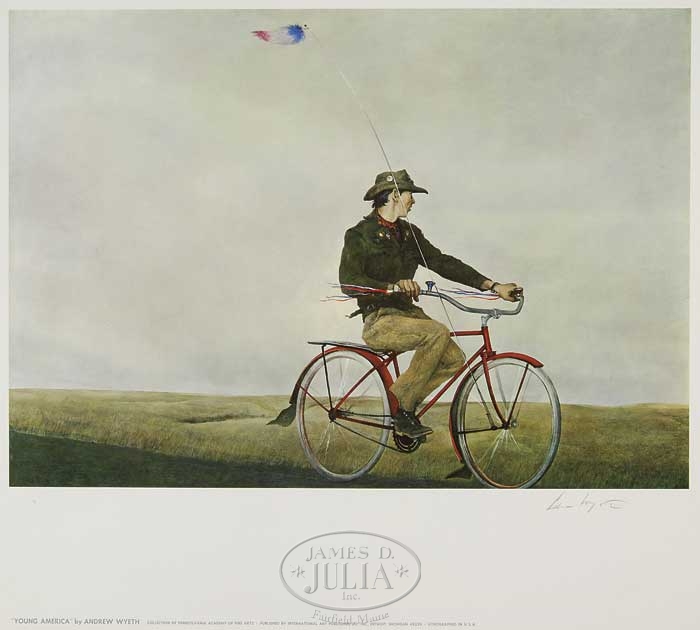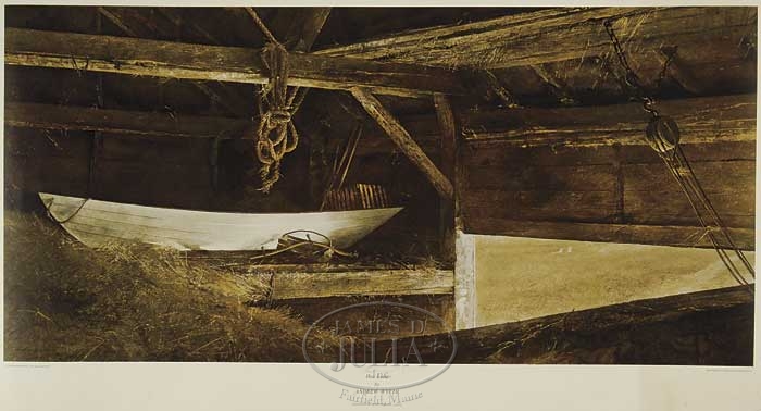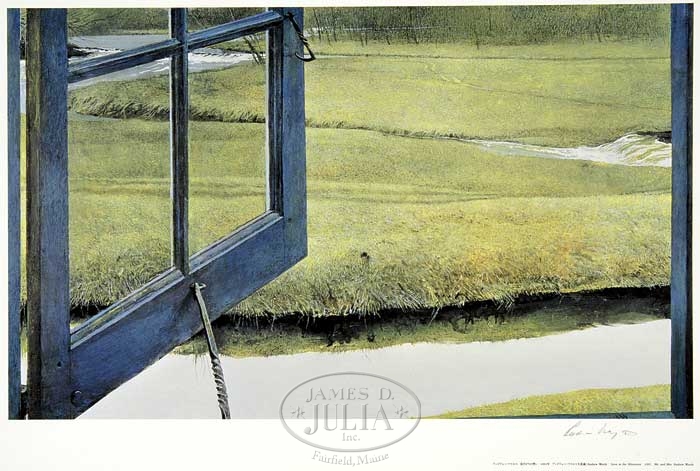OUTSTANDING LOT OF 25 SIGNED ANDREW WYETH PRINTS. From one private collection, taking many years to gather. This lot offers a rare opportunity to obtain prints that normally were not signed. The lot includes two framed signed prints and 23 unframed signed prints. 1. “CRESCENT”, framed, sight size 15-1/2″ x 21″ (full margin, not laid down). 2. “FULL MOON”, framed, sight size 18-1/4″ x 23″ (full margin, not laid down). 3. “BRAIDS” (poster), 25″ x 25″. 4. “WIND FROM THE SEA” (poster), 25″ x 33-1/4″. 5. “CLOUDS AND SHADOWS”, 20-1/2″ x 23-1/2″. 6. “BELOW DOVER”, 14-3/4″ x 20″. 7. “SEA ANCHOR”, 23-1/2″ x 20″. 8. “HELGA-CROWN OF FLOWERS”, 13″ x 10″. This print is mounted in a blue matte with separate signature paper. 9. “THE HUNTER” (poster), 25″ x 26″. 10. “STUDY FOR BARRACOON” (poster), 27-1/2″ x 29-1/2″. Signed by both Andrew Wyeth and Helga. 11. “RACCOON”, 33″ x 33″. 12-16. Japanese series, 14-1/4″ x 20-1/4″. “IDES OF MARCH”, MEGGA’S DAUGHTER”, “TRODDEN WEED”, “LOVE IN THE AFTERNOON”, FLOODPLAIN”. 17. “RURAL HOLIDAY”, 20″ x 24″. 18. “SEED CORN, 1948″, 20″ X 24”. 19. “BAREFOOT” (poster), 20″ X 28″. 20. “THE SLIP”, 23-1/4″ x 29-3/4″. 21. “HAY LEDGE”, 23″ x 42″. 22. “ALVARO’S HAYRACK”, 13″ x 24-1/2″. 23. “YOUNG AMERICA”, 20″ x 23-3/4″. 24. “ST. GEORGE’S PINES”,15-3/4″ x 20-1/4″. 25. “YOUNG FISHERMAN AND DORY”, 22-1/2″ x 35″. SIZE: As noted above. CONDITION: Very good. No tears. Full margins. 9-99859 (50,000-75,000)