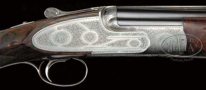 *CASED PAIR OF SABATTI ENGRAVED 20 GA ABBIATICO & SALVINELLI JOREMA PINLESS SIDELOCK GAME GUNS. SN 770/ 771. (1987) Cal. 20 ga. 2-3/4″ Chambers. This exceptionally fine pair of guns made when this illustrious company had hit its stride in producing some of the finest guns in the world, have 28″ finely struck demi-bloc barrels with flat, file cut, ventilated ribs. “I” and “II” are inlaid in gold at rear of ribs, on top levers, and on forend releases. “Abbiatico & Salvinelli” in small letters is inlaid in gold on left rear of top bbls. Bbl flats are stamped with 1987 Italian nitro proofs, “A & S”, and with SNs. Exceptionally well sculpted OU A & S patent pinless sidelock actions with fluted beads feature automatic safeties (S inlaid in gold), H & H style hand detachable lock pins, and non-selective single triggers. Single beaded small bow trigger guards have SNs inlaid in gold at grips. All metal parts are engraved with Gianmarco Sabatti’s incomparable English shaded scroll, with rose bouquet highlights, reminiscent of Boss’s house style. His signature appears on trigger plates. “Abbiatico & Salvinelli” is engraved on each lockplate, and on bottoms of actions. Spectacular, exquisitely marbled, and stump figured European walnut straight grip buttstocks match extremely well, and were obviously cut from the same blank. They measure approx 14-1/2″ over black “Decelerator” pads, and feature drop points, slight diamond hands, and well cut 28 LPI point pattern borderless checkering. Matching one piece ejector forends feature unusual adaptation of the Anson type release utilizing A & S crest sliding buttons placed in uncheckered central diamonds to release. BBL set no. “I”: Bore diameter: top -.621, bottom -.622. Bore restrictions: Screw chokes. Wall thickness: top-.036, bottom -.029. Drop at heel: 2-11/16″, drop at comb: 1-7/16″. Weight: 6 lbs. 11.5 oz. LOP 14-9/16″. BBL set no. “II”: Bore diameter: top -.619, bottom -.619. Bore restrictions: Screw chokes. Wall thickness: top-.035, bottom -.036. Drop at heel: 2-9/16″, drop at comb: 1-7/16″. Weight: 6 lbs. 11.8 oz. LOP 14-1/2″. Nizzoli leather two gun motor case has stitched leather corners, and is lined with maroon cloth with black leather A & S label, and gold Nizzoli medallion in lid. Case contains green felt wallet housing five additional choke tubes and wrench. CONDITION: Excellent. Bbls retain 95% orig blue, thinning at muzzles, and sides of ribs. Coin finished actions are mostly bright, slightly toned on right lockplate of gun no “I”. Stocks retain most of their orig rubbed oil finish with numerous minor marks from handling and use. Fairly deep (3/16″ diameter) dent is on comb of gun no. “II”. There is a small dent in front of latch on forend of gun no. “I”. Bores are excellent. Actions are tight. Ejectors are in time. Triggers work. Case leather is beginning to darken, with many scuffs and marks. Straps and handle are strong. Interior cloth shows rubs and marks from contact with guns, with some areas rubbed through. Label is excellent. Choke tubes are excellent. 4-44912 MGM18 (30,000-50,000)