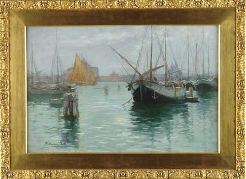 FRANCIS HOPKINGTON SMITH (American, 1838-1915) VENETIAN HARBOR. Outstanding watercolor shows several ships at mooring posts with sailboat behind. City is seen on edge of light green water. Signed lower left “F. Hopkington Smith”. Housed in its original gilt gesso decorated frame. Label attached to back “Wm. Clausen 381 Fifth Ave, New York”. PROVENANCE: A fine central Maine home. SIGHT SIZE: 16-1/2” x 24-3/4”. CONDITION: Very good. 9-98703 (3,000-5,000)