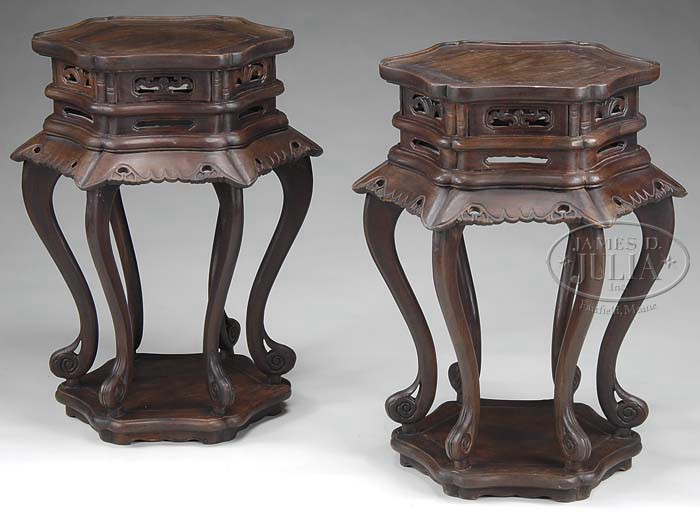 NICE PAIR OF CHINESE HONGMU FLOWER STANDS. Late 19th century. The hexagonal top with in-curved molded edges centering a hexagonal panel above the conforming double pierced and molded frieze joined to an out-sloping scrolled apron raised on six stylistic cabriole legs terminating in scrolled volutes on a hexagonal shaped plinth. SIZE: 29″ h x 23″ dia. CONDITION: Very good with cleaned original surfaces. 9-22157 (4,000-6,000)