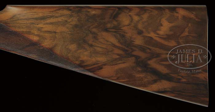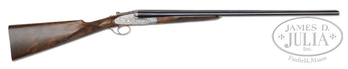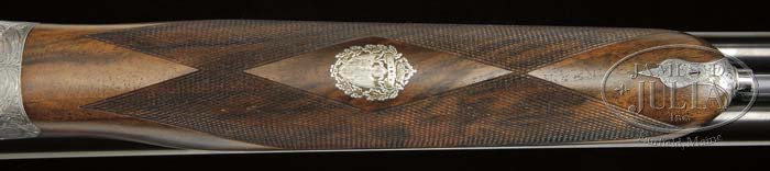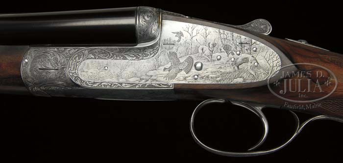 *VERY FINE GALEAZZI AND GOLDANI ENGRAVED ABBIATICO & SALVINELLI 28 GAUGE GAME GUN AND CASE. SN 391. (1982) Cal. 28 ga. 2-3/4″ Chambers. This elegant and dainty shotgun made during what many regard to be the best period of work by this esteemed firm, has beautifully struck 27″ chopper lump bbls with raised, flat, matted rib. Bbl flats are stamped with gauge, SN, and 1982 Italian nitro proofs. Craftsmen who built this fine gun have their names stamped on rear lump. Side of left bbl has “ABBIATICO & SALVINELLI” inlaid in small gold block letters. Nicely filed and fitted sidelock action features non-automatic safety and non-selective single trigger. Action is engraved with beautifully cut and shaded attenuated scrolled acanthus outlining Bulino scene on bottom of action depicting a pair of woodcock flitting through alders. Lockplates are fully engraved with exceptional Bulino vignettes of dogs and game birds; a pair of pointers contemplating two ruffed grouse disappearing over a hillside and into birch woodlands, on left sidelock, and a covey of bobwhite erupting from field into hedgerow on right with farm in background. The level of craftsmanship in both of these styles is beyond compare. The scroll was done by B. Goldani, whose signature appears on trigger plate. Games scenes are by highly regarded engraver, F. Galeazzi, whose signature appears in each scene. Single beaded scroll engraved trigger guard has SN inlaid in gold at grip. Finely marbled European walnut straight grip buttstock measures 14-1/4″ over checkered wood butt, and features diamond hand, drop points, and very cleanly cut 28 LPI borderless checkering. Matching semi-beavertail forend has silver inset A & S crest plate in central diamond, and Anson release. Bore diameter: left-.555, right -.552. Bore restrictions: left -.030, right -.012. Wall thickness: left -.033, right -.033. Drop at heel: 2″, drop at comb: 1-5/16″. Weight: 5 lbs. 9.6 oz. LOP: 14-1/4″. Leather Nizzoli case has stitched leather corners, and is lined with burgundy cloth with brown leather gold embossed A & S label. Case contains A & S marked oil bottle, spare striker bottle with strikers, and snap caps simply marked “28”. Case straps are in covered compartments, which also contains spare mainsprings. Also included are red cloth bags for buttstock and bbls. CONDITION: Excellent, near new, showing very little evidence of ever having been fired, since proof, with only a few minor rubs on lumps from assembly and disassembly. There is no noticeable discoloration to coin finish, and only a few minor marks on wood. Gun is mechanically excellent. Case leather has a few marks. Interior is excellent, as are accessories. 4-46053 MGM301 (22,500-32,500)
