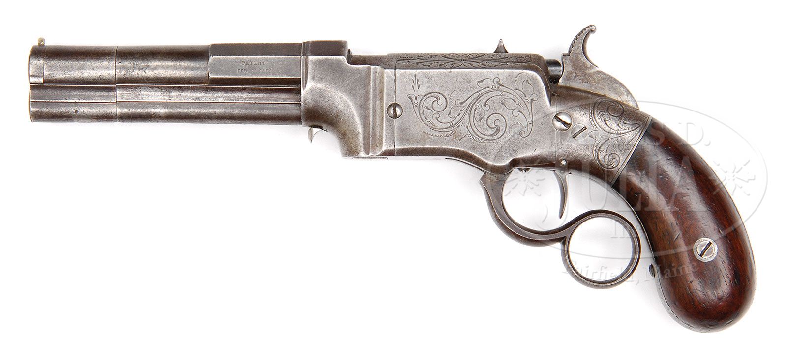 VERY RARE SMITH & WESSON NO. 1 LEVER ACTION PISTOL. SN E15. Cal. 31. Very rare pistol, the forerunner to the Henry rifle and therefore the Winchester dynasty. Patented in 1854 by Horace Smith & Daniel B. Wesson, they were only in production from about 1854-1855, with a total of only about 1,700 pistols produced in two models. Only about 1,200 of that production was in the 31 caliber. Pistol has a 4-1/8″ oct to rnd bbl that has integral magazine tube and full ribs with pinched post front sight and fixed pinched post rear sight in top flat of receiver. Mounted with 2-pc bag-shaped rosewood grips, matching numbered to this pistol. Frame & sideplates are typically engraved in light foliate arabesque patterns with foliate patterns on top side flats of the frame & sideplates, over chamber area, on back edge of hammer & back strap. SN is found on left side of butt strap, on an exposed part in the lever slot and inside the grips. No additional disassembly was effected to check for other matching parts. Octagonal section of the bbl has the standard markings of “CAST-STEEL” on right side flat, “PATENT / FEB 14 1854” on left side flat and “SMITH & WESSON / NORWICH, CT” on top flat. CONDITION: Very good to fine, all matching as noted. No orig finish remains being an overall blue/gray metal patina with scattered fine pinprick pitting and light discoloration. Grips have nicks & dings and are sound retaining most of their orig varnish. Mechanics are fine, bright shiny bore. 4-48123 JR336 (6,000-10,000)