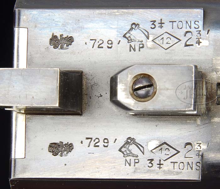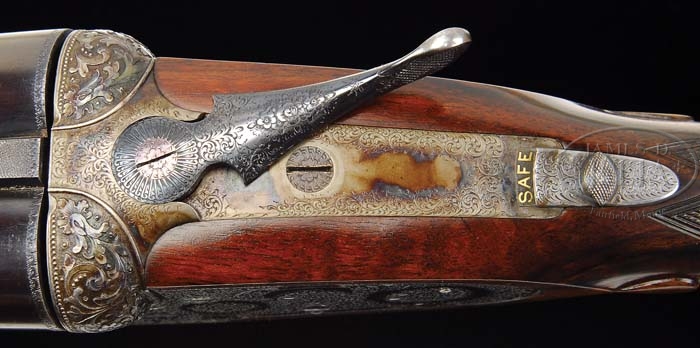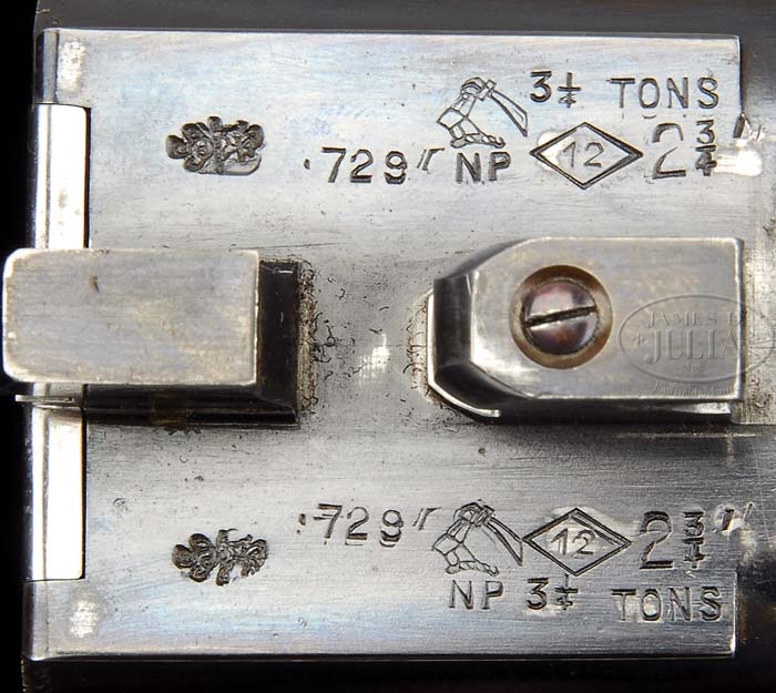 *FINELY ENGRAVED J.PURDEY AND SONS EXTRA FINISH SIDE LOCK EJECTOR SINGLE TRIGGER GAME GUN WITH EXTRA BARRELS AND CASE. SN 26794. (Ca. 1959) Cal. 12 Ga. 26″ and 28″ Chopper lump bbls. This very fine gun is engraved “James Purdey & Sons.” and “Audley House. South Audley Street. London. England.” on tops of bbls, with narrow, flat, matted, game ribs. Bbl flats have London nitro proofs for 2-3/4″ chambers. SN is stamped on bottoms of bbls along with barrel makers initials “J.A” (J. Aldous). Tube nos. “66797” and “66798” are stamped on loop of 26″ bbls; Tube nos. “66795” and “66796” on the 28″ bbls. Bottom ribs are engraved “Made especially for Dr. Edgar Lawrence”. Typical Beesley patent self opening action features Purdey non selective single trigger, automatic safety with “Safe” inlaid in gold, bushed strikers, and raised rib tumbler ends as cocking indicators. Case hardened action and lockplates are engraved with finely executed rose, scroll, and strapwork with “J. Purdey & Sons” in relief in cartouche on both sides of lock plates. Bottom of action is engraved “J. Purdey & Sons, London England” surrounded by rose and scroll garland with horned Greenman peering from termination of trigger plate. Fences are engraved with extremely well executed high relief open shaded acanthus scroll with rose terminations. Scroll engraved trigger guard has SN in relief on tang. Very fine honey colored nicely marbled and figured Circassian walnut straight grip buttstock measures 14-9/16″ over leather covered pad, and features 22 LPI checkering with mullered borders, drop points, and individual initials “EAL” inlaid in gold on toe line. Matching beavertail forend has Anson release. Actioners initials “B.D” (Ben Delay) are stamped on iron. 26″ Barrels: Bore diameter: left -.732, right -.731. Bore restrictions: left -.004, right -.002. Wall thickness: left -.035, right -.035. Drop at heel: 2-1/4″, drop at comb: 1-5/8″. Weight: 7 lbs. 3 oz, LOP 14-9/16″. 28″ Barrels: Bore diameter: left -.733, right -.733. Bore restrictions: left -.022, right -.016. Wall thickness: left -.034, right -.036. Weight: 7 lbs. 3 oz. Leather, toe under, two barrel case with stitched leather corners is marked “Abercrombie and Fitch, New York. Made in England”. Initials “EAL” are on lid. Interior is lined in maroon cloth with leather Purdey label. Accessories include 2-pc ebony cleaning rod, snap caps,”A and F” marked oil bottle, and ebony striker bottle with spare strikers. CONDITION: Excellent. Bbls retain nearly all original blue, thinning a bit at muzzles of both bbls, and with a few marks from contact with forend. Action retains 80% case color, silvering on beads and fences. Lock plates retain 95% of their case color, and most of their original varnish. Stocks retain most of their original finish with a few nicks and bumps. Checkering is very slightly worn. Action is tight. Bbls are on face. Drop shows little wear. Bores are excellent, bright and shiny. Ejectors are in time. Single trigger works well. Exterior of case has numerous scuffs in leather. Original straps show considerable wear, but are strong. Handle is a replacement, and needs further attention. Interior cloth is good, partitions are tight. Scuff on label from contact with action. Accessories are fine. 4-38639 MGM46 (30,000-40,000)