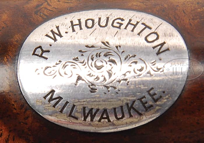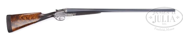 JAMES PURDEY SELF OPENING SIDE LOCK PIGEON GUN (NO SAFETY) WITH EXTRA BARRELS AND CASE. SN 16047. (Ca. 1897) Cal. 12 Ga. 3″ Chambers. Two sets of 30″ Chopper lump bbls are both engraved “J. Purdey & Sons, Audley House, South Audley Street, London.”, and “Made of Sir Joseph Whitworth’s Fluid – Pressed Steel” on raised flat plain top rib. Bbl flats show London nitro proofs for 1-3/4 oz of shot, and long chambers, as is common in pigeon guns of this period. Bottoms of bbls are stamped with SN, choke, and barrel makers initials “WH” (William Hill). Barrel set no. 1 has tube numbers “20499” and “20500” on loop. Barrel set no. 2 has tube numbers “20501” and “20502”. Rear lumps are also stamped “1” and “2”, respectively. Beesley patent self opening action has no safety, double triggers with articulated front, hidden third fastener, side clips, and bushed strikers. Action is engraved with very finely executed Purdey house style rose and scroll, probably the work of J. Lucas, head engraver. “J. Purdey & Sons” is engraved on both lock plates, and “Purdey’s Patent” is engraved on bottom of action; “Patent” is on top lever. Trigger guard has typical scroll engraving with SN on tang. Beautifully flame figured and mottled Circassian walnut straight grip buttstock measures 15-1/16″ over leather covered pad and features 20 LPI checkering with mullered borders, drop points and silver oval engraved “R. W. Houghton, Milwaukee”. Matching splinter forend is fully checkered except on top edge, with Anson release. Barrel set “1”: Bore diameter: left -.734, right -.735. Bore restrictions: left -.034, right -.020. Wall thickness: left -.033, right -.031. Drop at heel: 2″, drop at comb: 1-1/4″. Weight: 7 lbs. 15.7 oz, LOP 15-1/16″. Barrel set no. “2”: Bore diameter: left -.733, right -.733. Bore restrictions: left -.035, right -.034. Wall thickness: left -.030, right -.031. Weight: 8 lbs. 0 oz. New leather case with salmon colored canvas outer cover has stitched leather corners. Interior is lined in maroon cloth with Purdey leather label and paper label with particulars of this gun. Accessories include 2-pc wooden cleaning rod, oil bottle, Purdey marked snap caps, leather wallet containing cleaning brushes, leather covered hand guard, leather straps for case, and key. PROVENANCE: Copies of partial piece of factory letter giving history of this gun and clipping from NY Times Dec. 2, 1900 mentioning R. W. Houghton. CONDITION: Very fine. Bbls retain virtually all of a professional re-black. Engraving is slightly washed. Bores are excellent. Action retains about 70% of its case color, silvering on beads, bottom, and fences. Lock plates retain approx 90% of their case color. Trigger guard and top lever retain virtually all their re-blue. Top lever screw shows some use and polishing, with engraving washed. Stocks retain virtually all of professional oil refinish. Checkering is slightly worn, borders are thin. Action is tight. Bbls are on face. Case and accessories are as new. 4-38323 MGM48 (27,500-37,500)