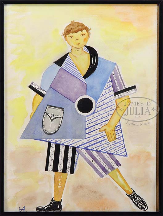 NINA EVSEEVNA AIZENBERG (Russian, 1902-1974) AVANT GARDE COSTUME SKETCH. Watercolor portrait of a boy with avant garde geometric striped outfit. Initial monogram lower left. Housed in a modern black metal frame. SIZE: Sight: 15-3/4″ x 11-1/2″. PROVENANCE: From a prominent Boston, MA collection CONDITION: Very good. 9-98138 (2,000-4,000)