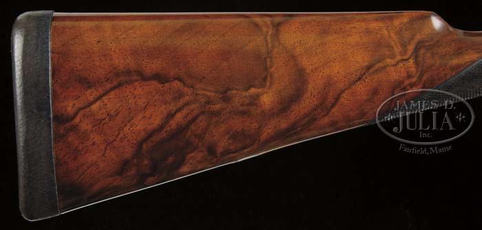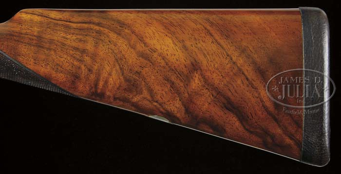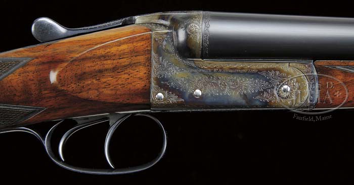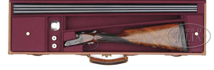 *DAINTY HOLLOWAY AND NAUGHTON BOXLOCK GAME GUN WITH CASE. SN 41676. Cal. 28 Ga. 2-1/2″ Chambers. 28″ Dovetailed bbls are engraved “Holloway & Naughton Ltd Makers, Birmingham, London & Paris” on narrow low game rib. Bottoms of bbls are stamped with Birmingham nitro proofs and London 1997 re-proofs for 2-1/2″ chambers. SN is stamped on splinter. Nicely scaled boxlock action features automatic safety (SAFE engraved) and double triggers. Action is engraved with about 60% coverage well cut English scroll. “Holloway & Naughton Ltd” is on either side. Blued floorplate, top lever and trigger guard are also scroll engraved,. SN is on trigger guard tang. Nicely marbled and figured flesh-toned Circassian walnut buttstock measures 14-3/4″ over dark brown leather covered pad. Vacant silver oval is on toe line. 20 LPI flat top point pattern checkering has mullered borders. Splinter forend with inset ebony tip has spring detent release. Bore diameter: left -.560, right -.552. Bore restrictions: left -.012, right -.000. Wall thickness: left -.029, right -.030. Drop at heel: 2-1/8″, drop at comb: 1-3/8″. Weight: 4 lbs. 12.5 oz, LOP 14-3/4″. Older leather case with stitched leather trim is newly lined with maroon cloth. Reproduction Holloway & Naughton paper label is in lid. Interior has two covered compartments with brass knobs, and contains 2-pc cocobolo and brass cleaning rod, round oil bottle, pair of snap caps, and key with attached leather label stamped “Michael Messina, Maker, East Meadow, NY”. Case has greenish gray zippered canvas outer cover with brown leather trim. CONDITION: Excellent as completely refurbished. Bbls retain virtually all of a high quality re-blue. Action retains all of a nicely colored re-hardening. Floorplate, trigger guard, and top lever retain nearly all of a correct charcoal blue. Screw slots are good. Stocks show nearly all of a hand rubbed oil finish. Checkering is slightly worn, and a bit dirty. Mullering has been freshened. Leather covered pad is new. Bores are very fine, bright and shiny, with right bbl showing some slight frosting. Action is tight. Right bbl is slightly off face. Case leather is very fine. Straps and handle are good. Interior, accessories and outer cover are excellent. 4-41885 MGM69 (7,000-9,000)