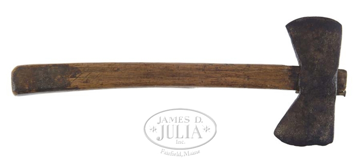 RARE 18TH CENTURY DBL BIT BELT AXE. Dbl bitted blade 5-3/8” wide with 2-3/4” & 2-1/2” blades. Hickory handle. CONDITION: Moderate pitting. 4-55172 (600-1,200)