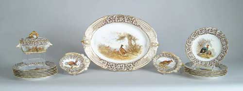 ROYAL WORCESTER SEVENTEEN PIECE HAND PAINTED GAME BIRD SET. Royal Worcester mark to bottom in black, date letter indicates 1889. Ribbon above mark “Royal Worcester Vitreous”. 17-1/2” x 13” platter has bird head and wing handles and brown transfer flowers on border. A scene of pheasant amongst smaller pheasants in landscape. 7-1/2” sauce tureen with deer handles and grouse in landscape scenes. Matching cover with naturalistic handle and decoration, has hole for ladle. Two 7” x 5” smaller dishes with similar bird and wing single handle decorated with grouse. An 8” x 5” scallop handled dish also has grouse. Twelve 9” shaped edge plates with different birds in landscape. Backs marked “W3425”. An outstanding set with beautiful decoration. CONDITION: Very good. 9-99411 (5,000-7,000)