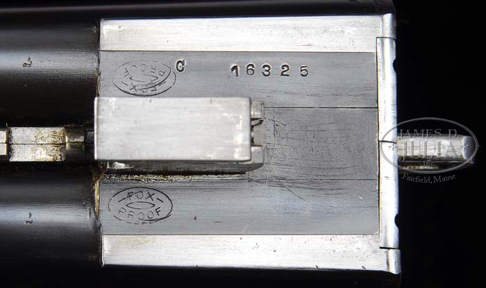 Correction: This gun is NOT a Class III Firearm as indicated by two asterisks (**) preceding the title. It is a Modern Firearm and should have one asterisk preceding the title (*). **A.H. FOX CE GRADE SIDE BY SIDE SHOTGUN WITH KRUPP STEEL BARRELS. . SN 16325. Cal. 12 ga, 30″ Krupp steel bbls, matted tapered concave rib with brass front and white center sighting beads, FULL/FULL choke, 2-3/4″ chambers, ejectors & dbl triggers made without safety. Top of right bbl is marked “KRUPP FLUID STEEL MADE BY” and left “A.H. FOX GUN CO. PHILA PA”. Sides of each bbl at chamber have about 1-1/2″ wedge of open scroll engraving. Receiver is engraved in “C” pattern with oval on left side, with 2 feeding quail in opposite directions with banner “ANSLEY H. FOX” over top. Right side oval with 2 feeding snipe in opposite directions with banner of “ANSLEY H. FOX” over top. Bottom center has circle with setter on point, with trigger plate and balance of receiver being a foliate scroll. Top tang is made without safety and engraved with some geometric scroll. Mounted with nicely figured walnut, checkered side panels, checkered straight grip, Silvers type solid red recoil pad, and checkered splinter forend. Bore diameter: left -.725, right -.725. Bore restrictions: left -.034, right -.036. Wall thickness: left -.035, right -.034. Drop at heel: 2-5/8″, drop at comb: 1-5/8″. Weight: 7lbs. 12oz. LOP 14″. Accompanied with J.T. Callahan letter identifying as CE grade, 12 ga., 30″ choked FULL/FULL, walnut stock, 14″ LOP, 1-5/8″ drop at comb, 2-5/8″ drop at heel, straight grip, weighing 7lbs 11oz. Under notes “tip jars-not catch, no safety”, (from reverse of card) bore out stock. Gun was shipped from Philadelphia June 1, 1910 orig consignee, E.R. Parker – no address. Also accompanying gun are repro Fox tags verifying above information. CONDITION: Very fine. Bbl retain 97-98% orig blue with just some very slight muzzle wear, and a few minor typical handling marks. Receiver shows strong orig case colors, under what appears to be a coat of dried preservative, slightly silvering across bottom, but strong on sides & across top. Trigger guard shows good orig blue across bow with some silvering in grip area. Stock is sound with tiny chip behind top tang, good checkering, minor nicks & dings & light scratches, and what appears to be orig finish that has been rubbed and cleaned. Forend is sound with good checkering, some minor chips at tip, a few minor handling marks, and retains orig finish. Forend latch & exposed forend metal retain good orig blue. Triggers are crisp, made without safety, strong ejectors, bright shiny bores, as gun appears to have seen only a little use. 4-39137 BDT46 (4,000-6,000)
