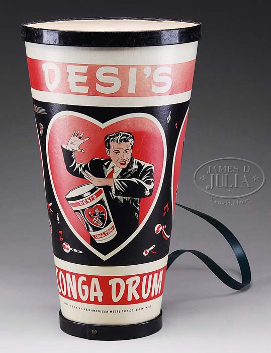 DESI’S CONGA DRUM. Mfg by A&A American Metal Toy Co. Brooklyn, NY. Very scarce TV related toy conga drum copyright 1952 by Lucille Ball of “I Love Lucy” fame. Great images of Desi with drum and maracas. SIZE: 19″ t. CONDITION: Some fading to one side of drum (mostly to top side). Drum head has two very small tears that do not affect drumming action. Toy is overall good to very good complete with original vinyl shoulder strap. 1-9257 (1,200-1,500) Auction: Advertising, Toy & Doll - Spring 2009 Please Note: All prices include the hammer price plus the buyer’s premium, which is paid by the buyer as part of the purchase price. The prices noted here after the auction are considered unofficial and do not become official until after the 46th day. |
