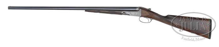 *PARKER BROTHERS DHE GRADE MADE WITHOUT SAFETY. SN 213356. Cal. 20ga, 28″ bbls, matted, tapered concave rib, brass front and ivory center sighting beads, IMP.MOD/IMP.MOD chokes, 2-3/4″ chambers, ejectors and single selective trigger. Top rib is marked “PARKER BROS. MAKERS. MERIDEN. CT. U.S.A. TITANIC STEEL”. The “0” size frame has usual D grade engraving with ribbon on each side marked “PARKER BROS”, foliate arabesque scrolls with pointer on left side, setter on right, and 4 pheasants on trigger plate. Top tang made without safety. Mounted with nicely figured walnut, side panels with spear tip drop points, checkered straight grip, black vented Pachmyer recoil pad, blank silver oval, checkered splinter forend. Bore diameter: left -.620, right -.620. Bore restrictions: left -.020, right -.016. Wall thickness: left -.029, right -.028. Drop at heel:2-5/8″ , drop at comb:1-3/4″. Weight: 6lbs. 3oz. LOP 14″. The book Parker Gun Identification and Serialization identifies as Grade T13, D Grade with Titanic bbls, single trigger and ejectors, straight grip, 20ga with 28″ bbls. Its unusual to find 20ga gun made without safety. CONDITION: Very good. Bbls retain 95% orig blue with normal nicks, dings & scratches, a couple small areas of fine surface oxidation and rub mark on bottom from forend. Receiver has traces of orig color in protected areas with balance a blend of silver & gray patina with sharp engraving. Stock is sound with slightly worn checkering, a repair on lower right side at buttplate of a neatly inlet triangular piece of wood, normal nicks & handling marks and retains an open-grain oil finish blending with hand-worn patina. Forend is sound with moderately worn checkering, normal minor nicks & dings and retains an open-grain oil finish blending with hand-worn patina. Mechanics are good, strong ejectors with right ejector hammer not staying cocked. Gun is tight, top lever slightly left of center. Bores are bright with a couple of tiny, shallow pits. 4-40826 BDT100 (5,000-7,000)
