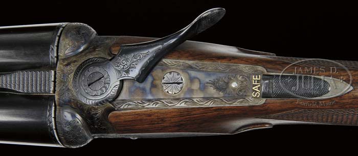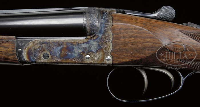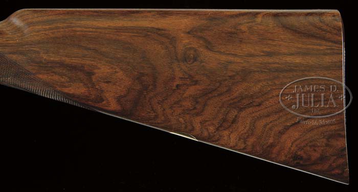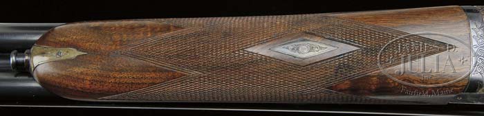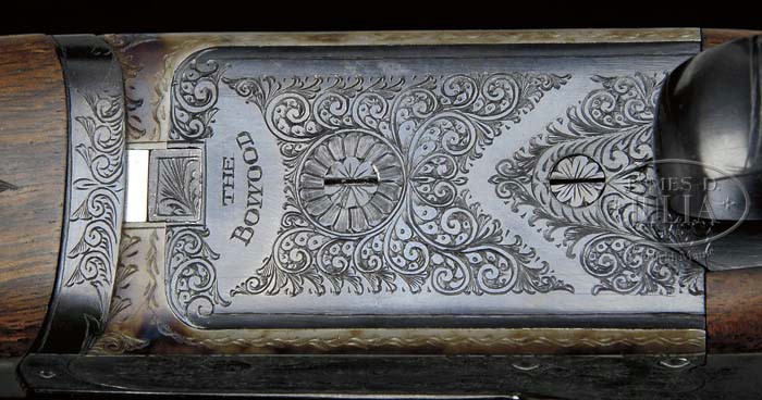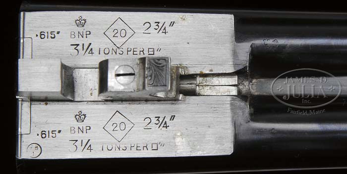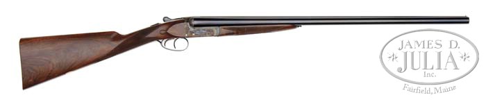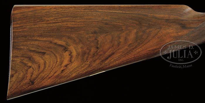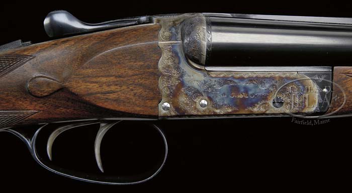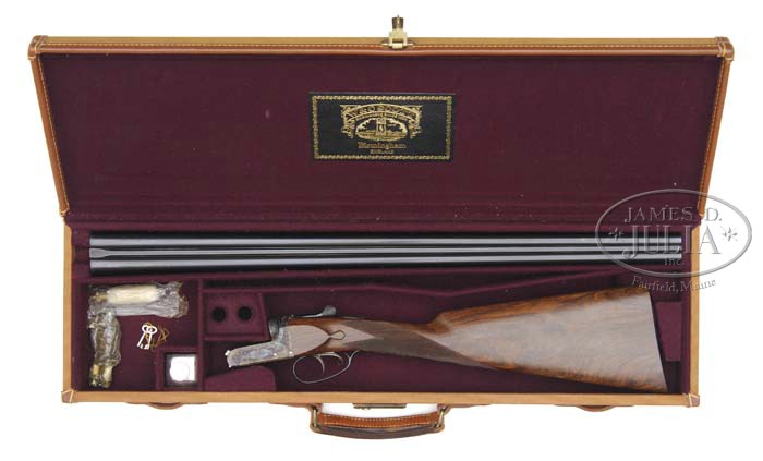 *W & C SCOTT “BOWOOD” BOXLOCK EJECTOR GAME GUN WITH ORIGINAL CASE. SN 146326. Cal. 20 Ga. 2-3/4″ Chambers. 26″ Dovetailed bbls with Churchill rib are engraved “W. & C. Scott Gunmakers.” and “Birmingham. England.” on tops. Bbl flats are stamped with Birmingham nitro proofs for 2-3/4″ chambers. Loop is stamped “Made in England”. Importers mark is on bottom of right bbl “J K Devco Inc Houston TX”. Scallop-backed case hardened boxlock action has automatic safety (SAFE inlaid in gold), and is engraved with about 60% coverage shaded scroll. “W & C. Scott.” is on either side of action and “The Bowood” on floorplate. Blued floorplate, top lever, and trigger guard are also scroll engraved. SN is on trigger guard tang. Nicely marbled European walnut straight grip buttstock measures 15″ over checkered wood butt. Hallmarked gold oval is on toe line. Stock also features drop points and point pattern checkering with mullered borders. Matching splinter ejector forend has Anson release. Bore diameter: left -.615, right -.614. Bore restrictions: left -.012, right -.005. Wall thickness: left -.032, right -.028. Drop at heel: 2″, drop at comb: 1-3/8″. Weight: 5 lbs. 9.6 oz, LOP 15″. Makers brown canvas case with brown leather trim is lined with maroon cloth with gold embossed leather Scott label in lid. Case contains 2-pc brass and wood cleaning rod with brushes and jags, and square oil bottle. Case has zippered grayish green canvas outer cover with brown leather trim. CONDITION: Near new, with a few scattered minor marks in wood. There are some extractor wipe marks on breech face, and bbl contact marks from case. Bores are excellent. Action is tight. Bbls are on face. Ejectors are in time. Case is excellent, as are accessories and outer cover. A fine light weight bird gun. Not produced since 1990, the last suggested retail was $12,500.00. 4-41884 MGM66 (5,000-7,000)