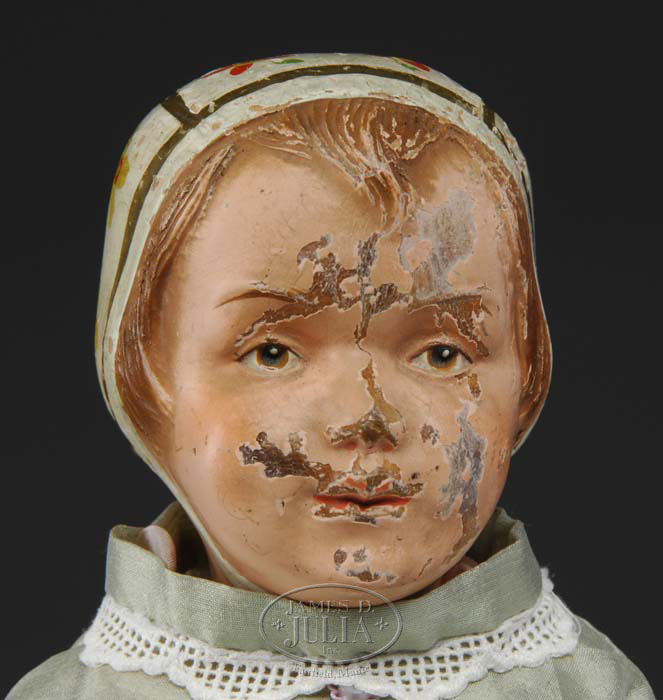 RARE 15″, (38 CM), SCHOENHUT WITH MOLDED AND PAINTED BONNET. This seldom found girl has brown intaglio painted eyes, and a molded bonnet decorated with red and yellow flowers with green leaves with a strap attached under the chin. She is on a full jointed spring strung body with the Schoenhut decal label, and wears a one-piece green drop-waist dress with newer underwear, socks, and shoes. CONDITION: Although she has obviously lost quite a bit of paint on the face, there is no evidence of repainting. 1-7517 RS (1,750-2,000) Auction: Advertising, Toy & Doll - Spring 2007 Please Note: All prices include the hammer price plus the buyer’s premium, which is paid by the buyer as part of the purchase price. The prices noted here after the auction are considered unofficial and do not become official until after the 46th day. |