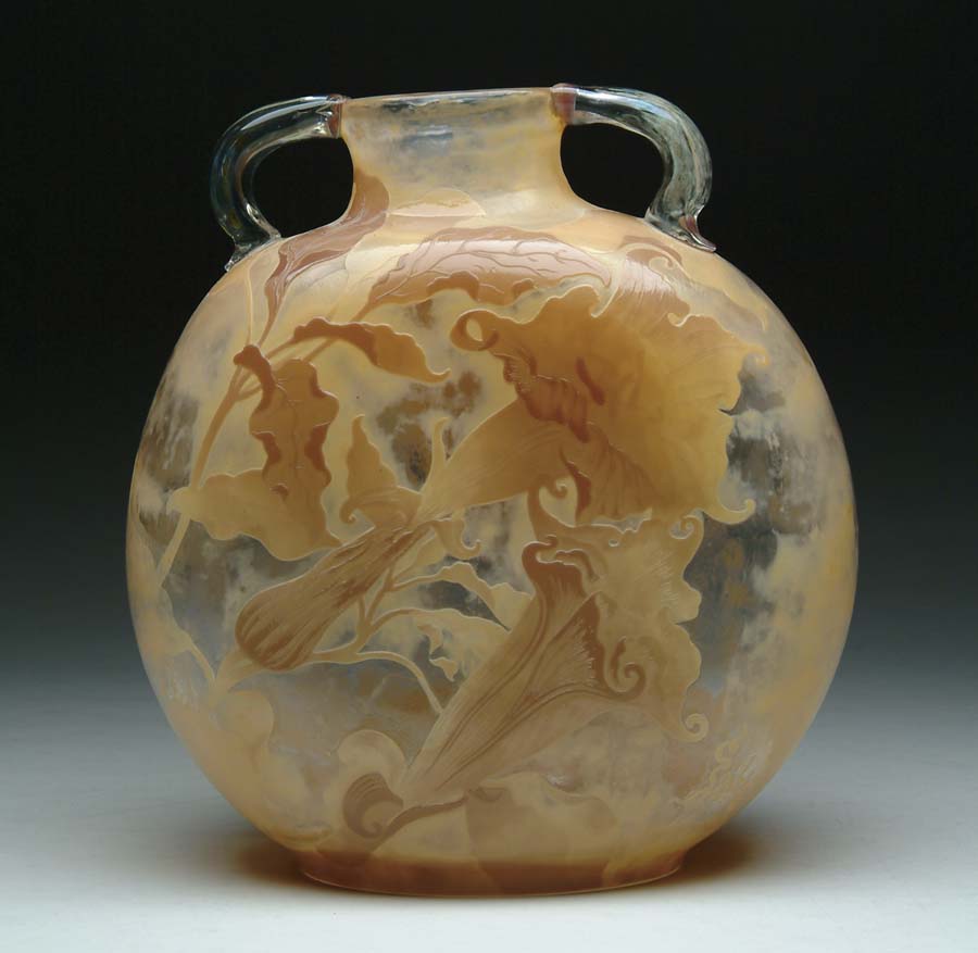 GALLE TWO HANDLED CAMEO VASE. Cameo decoration of beige and amethyst flower blossoms and leaves over clear glass with two clear crystal applied handles. Signed on the side of the canteen shaped vase in cameo relief “Galle 16”. SIZE: 11 in. t x 9-1/2 in. w. CONDITION: Very good to excellent. 5-60615 (1,500-2,500)
