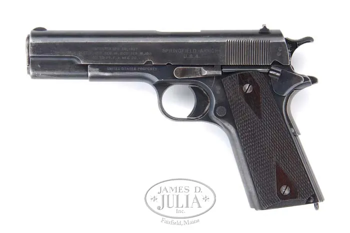 *VERY RARE SPRINGFIELD ARMORY MODEL 1911 SEMI-AUTO MILITARY PISTOL. SN 103703. Cal. 45 ACP. Rare Springfield 1911 from the 2nd Springfield Contract of 1914. It has usual configuration with orig fixed sights and Springfield slide markings with flaming bomb proof at left rear edge of slide & on frame above magazine release. Left front side of frame has “UNITED STATES PROPERTY” and right side of slide has “MODEL OF 1911 U.S. ARMY” with the Springfield eagle toward left rear of slide. Mounted with orig Springfield diamond checkered walnut grips and has flat mainspring housing with long hammer spur & short grip safety spur. Bbl bushing & slide lock are orig Springfield equipment with small “S” inspector marks. No further disassembly was affected to check for other matching parts. Bbl is an early field replacement with a “P” proof on lug. Accompanied by a “1915” dated Rock Island Arsenal, brown leather swivel holster with its orig leather strap, an early Mills web belt & a “1914” dated Mills web magazine pouch with eagle snaps containing two orig, very early Springfield magazines with folded bottoms, lanyard loops & copper slide pads at top. Also accompanying is a small box containing 29 Frankford Arsenal 45 ACP cartridges with “1 14” head stamp date. Additionally accompanying is a flat sided rnd metal oiler. Also accompanying is a fine Boyt canvas pistol rug. CONDITION: Fine to very fine. Slide retains 60-65% dull orig blue with holster wear & thinning over top. Frame retains about 70-75% strong orig blue on sides & in sheltered areas with front of frame, trigger guard & front strap thin blue. Grip safety retains about 50% thin blue & mainspring housing about 80%. Grips are sound showing light to moderate wear with a dark oil finish. Mechanics are fine, worn bore. Holster retains about 80% orig russet brown finish with some flexing on flap. Web belt & mag pouch are fine showing very light wear. Two magazines are fine, being mostly a silver/gray patina on top 3/4 with bottoms a dark blue/gray patina. Oiler is fine. Pistol rug is about new. 4-35076 (6,000-8,000)