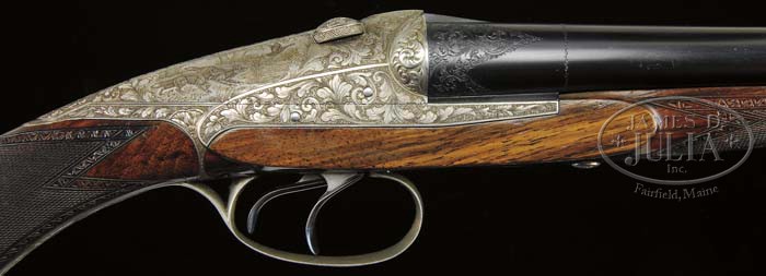 *20 GA. DARNE HORS SERIES V GAME GUN WITH LEG O’ MUTTON CASE. SN 4H701. Cal. 20 ga. 2-3/4″ Chambers. 25-3/4″ Mono-bloc bbls with matted, very low, (plume) rib and no under rib, are stamped “Darne Brevet S. G. D. G” with proofs and “65” along with newer stamping of “70” with “H. S.” (Hors series) engraved on bbl flats. Bottoms of bbls are stamped with French triple proofs, choke information, and “.4H701.” (SN) Coin finished sliding breech action with obturator discs, is engraved with semi-relief acanthus scroll with small scroll background outlining scenes of game. A trio of roe deer, a buck with 2 does, are in open woodlands on left; a pair of foxes are flushing a duck from marsh on right side of sliding breech. Fences are full relief carved with acanthus scroll. Sliding safety button is on left side of action. Trigger plate with push button bbl takedown is engraved with monogram “RN”. Steel trigger guard is also scroll engraved. Lightly marbled and figured European walnut semi-pistol grip buttstock measures 15″ over black “White Line” solid pad. Point pattern checkering is at about 30 LPI with broad geometrically carved borders. Matching forepiece has large horn tip. Bore diameter: left-.629, right -.631. Bore restrictions: left -.026, right -.015. Wall thickness: left -.018, right -.022. Drop at heel: 2-11/15″, drop at comb: 1-5/8″. Weight: 5 lbs. 6 oz. LOP 15″. This gun comes in its tan leather leg o’ mutton case complete with carrying straps. CONDITION: Excellent. Bbls retain nearly all of their orig blue, with one or 2 minor marks, and some minor scuffing on locking lug from assembly and disassembly. Action retains nearly all of its coin finish. It has browned and toned somewhat from accumulated oil, and could use a good cleaning. Stocks have had some added oil rubbed in over their orig finish, which has worn slightly on sharp edges. New pad is slightly above stock. Bores are excellent, bright and shiny throughout. Action is crisp. Case leather is still light in color and supple, with a few heavy scuffs. Straps are good. Hinge is beginning to detach. A fine lightweight fast handling small bore gun. 4-45116 MGM211 (6,000-9,000)