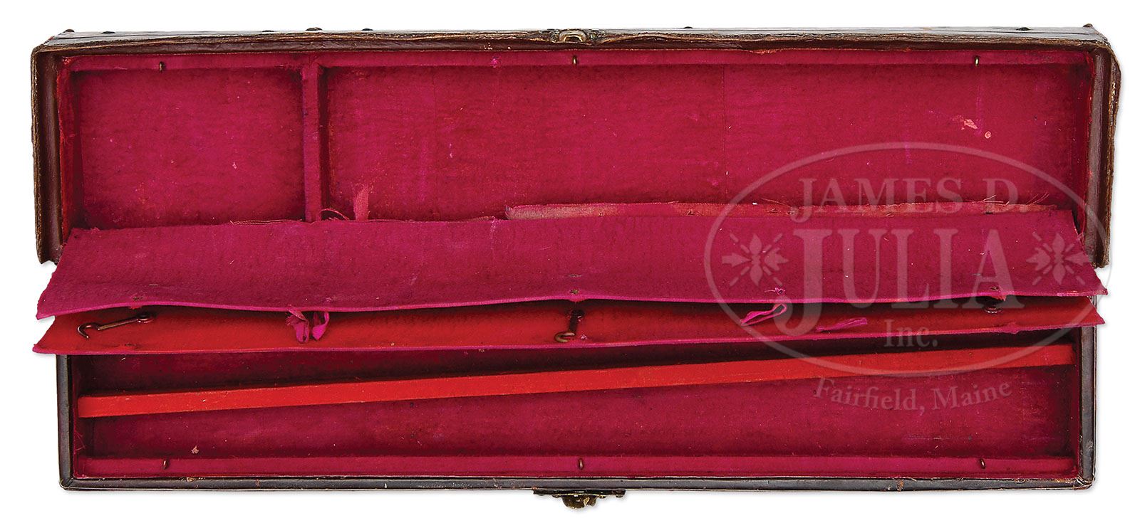 CASED MAYNARD MODEL 1865 PERCUSSION SPORTING RIFLE 2-BARREL SET. SN 26375. Cal. 40 and 20 ga. Fine sporting & target rifle with 26″ oct to rnd bbl, tiny globe front sight, fixed rear sight and elevating tang peep sight. Made without forearm, this rifle is mounted with highly figured, checkered American walnut buttstock with straight grip & Maynard smooth steel buttplate. Left side of receiver has the Maynard name & 2-line patent dates with the Mass Arms name & address on the right side. Bottom tang, along with the SN has the date “1865” which signifies that this rifle was produced from leftover Civil War carbine parts as a sporting rifle. These unusual rifles utilized a self-contained cartridge with wide, flat, thin rim that had a flash hole in the center and utilized a percussion cap for ignition. Although these sporting rifles are known as the Model 1865, according to Flayderman’s Guide to Antique American Firearms they were actually produced in the period 1863-1865, simultaneous with wartime carbines and then after the war as the Model 1865. Accompanied by an orig motor case style half-split brown leather trunk case that is fuchsia colored velvet lined with separate covered compartments in the lid and bottom. The lid is made for the buttstock and the bottom is compartmented for the two bbls. Case furniture is repoussed cast brass with a lock on the front that has its functioning key. Top of the case has a partial shipping label that is partially legible. Bottom of the case has what is probably a duplicate of the top label with the return address “A.A. FIDD / 44 MANCHESTER ST. / ROCHESTER, N.Y.”. It is addressed to “JOS. C. LOWE / 9125 NORTH AVE. / LACKLAND STA. / ST. LOUIS CO. / MO.”. Also accompanied by an orig Maynard/Mass Arms all-steel, 2-cavity, 40 caliber bullet mold with sprue cutter that has the Mass Arms address on the right side. Additionally accompanied by 2-pages of genealogical research. One is regarding Jos. C. Lowe who, in 1870, was 30 years old, a colored man living in Hannibal, Marion Co., Missouri (north of St. Louis). The 1880 census shows him living in Kansas. The second sheet is an attempt to discover information on A.A. Fidd. The only person resembling that name was Adelbert Fidd who, in 1870, was a 20-year old carriage maker living in Moravia, Cayuga County, NY (south of Rochester, NY). High grade examples of this rifle are scarce; 2-bbl sets are very scarce and motor case examples such as this are rare. PROVENANCE: Barnes Family Collection. CONDITION: Fine. Rifle bbl retains about 98% strong orig blue with only light muzzle end wear and faint sharp edge wear on the octagonal section; receiver & lever retain about 90% moderately faded orig case colors. Wood is sound and retains most of a lightly restored finish with freshened checkering. Mechanics are fine, bright shiny bore. Shotgun bbl retains 93-95% thinning orig blue turning a little plum on the rear 1/3, bright shiny bore. Case shows heavy wear with both end straps & keepers missing; handle & keepers are replacements. There is edge wear on the lid, otherwise case is sound; interior is moderately to heavily faded with the inside lid partition cover loose; bullet mold is a cleaned gray metal patina with strong cavities. 4-47648 JR258 (2,000-3,000)