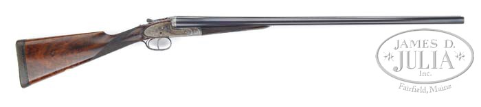 *VERY FINE JAMES PURDEY ROUND BODY SIDE LOCK EJECTOR GAME GUN WITH CASE. SN 22912. Cal. 16 Ga. 2-1/2″ Chambers. This wonderful little gun has 28″ chopper lump bbls w/ “J. Purdey & Sons. Audley House, South Audley Street. London. Made of Sir Joseph Whitworth’s Fluid Pressed Steel” on narrow concave game rib. Bbl flats have London nitro proofs for 2-1/2″ chambers. Bottoms of bbls are marked “Choke” and SN. “Made in England” is on splinter. Whitworth tube nos. “56008” and “56009” are on loop. Barrel makers mark WH (William Hill) is on left bbl. Case hardened round body action has bushed strikers, automatic safety, articulated front trigger, raised rib tumbler end cocking indicators, and old style ejectors. Action is engraved w/ very well executed Purdey house style rose and scroll w/ “J Purdey & Sons London” on bottom of action, and “J Purdey & Sons” on each lock plate. Single beaded trigger guard has scroll and SN at grip. “Safe” is inlaid in gold on top tang. Lightly marbled and figured European walnut straight grip buttstock measures 14-3/16″ over leather covered pad, and features gold oval w/ initials “A.C.D.” engraved, drop points, and 20 LPI checkering w/ mullered borders. Anson release splinter forend is marked w/ SN and initials “A.F” (Alf Fullalove, Actioner), w/ engraving, wood, and checkering to match remainder of gun. Bore diameter: left -663, right -663. Bore restrictions: left -.029, right -.009. Wall thickness: left -.033, right -.032. Drop at heel: 2-5/16″, drop at comb: 1-1/2″. Weight: 6 lbs 3oz. Original oak and leather case has brass corners and hardware w/ initials “A C D” engraved on central medallion. There is an 1-1/4 x 4″ area of leather missing on lid where an older embossed set of initials were removed. Interior of case is lined in scarlet cloth w/ James Purdey leather label, and paper charge label w/ specifications for this particular gun. Accessories include a leather wallet w/ pull-through cleaning equipment, bone striker bottle w/ strikers and springs, and Purdey marked oil bottle and snap caps. CONDITION: Excellent. Bbls retain virtually all of a very high quality London re-black, w/ very little polishing being done, w/ all engraving and edges sharp. There are a few light scratches on right side of bbls near forend. Action retains 70%-80% original case color, silvered on front bottom, and on fences. Trigger guard retains 90% original bright blue, silvering on bead. Top lever has 80% of its bright blue, silvering on thumb piece. Safety button has traces of its original fire blue in protected areas. Stocks retain most all of their original finish, dulling a bit w/ numerous small nicks and marks from use. Checkering is slightly worn, and a little dirty. Bores are bright and shiny. Action is tight, bbls are on face. Ejectors are in time. Drop is good, showing little wear. Case is fine w/ numerous marks and scuffs on leather. Interior partitions are solid. Cloth has areas of discoloration from contact w/ gun. Purdey label is very fine. Charge label is darkened. Accessories are fine. To find a gun with this configuration and state of preservation is unusual … a real treasure. 4-37716 MGM75 (37,500-47,500)