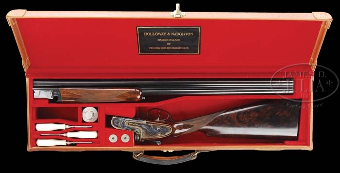 *HOLLOWAY AND NAUGHTON “WOODWARD” OVER-UNDER ROUND ACTION GAME GUN WITH CASE AND ACCESSORIES. SN H & N 12-71. Cal. 12 Ga. 2-3/4″ Chambers. 27″ Demi-block barrels with low, narrow, flat, matted rib engraved “Holloway & Naughton England,” have 2008 London proofs for 70mm chambers. Round body sidelock action features automatic safety, with “SAFE” inlaid in gold, double triggers, and raised rib tumbler end cocking indicators. Action and lockplates have 90% coverage of extremely well executed fine English shaded scroll with large rose bouquets in classic style. “HOLLOWAY & NAUGHTON” is engraved in riband on both lockplates. Trigger guard has matching scroll engraving with SN on grip. Very fine darkly marbled and slightly figured European walnut straight grip buttstock measures 14-7/8″ over checkered wood butt, and features drop points and 26 LPI checkering with mullered borders. One piece matching forend has Anson release. Bore diameter: top -.734, bottom -.735. Bore restrictions: top -.016, bottom -.011. Wall thickness: top -.031, bottom -.028. Drop at heel: 2-3/8″, drop at comb: 1-1/2″. Weight: 7 lbs. 6.2 oz, LOP 14-7/8″. High quality leather case has stitched leather corners. Interior is lined in crimson cloth with black leather Holloway & Naughton label. High quality accessories, most marked Holloway & Naughton, include 2-pc ebony and German silver cleaning rod, round oil bottle, snap caps, 3 turn screws with ivoroid handles, as well as jags and brushes. CONDITION: Excellent, essentially as new. Case is like new with a few minor marks, leather has light whitish haze. Interior and accessories are as new. 4-39029 MGM160 (65,000-85,000)