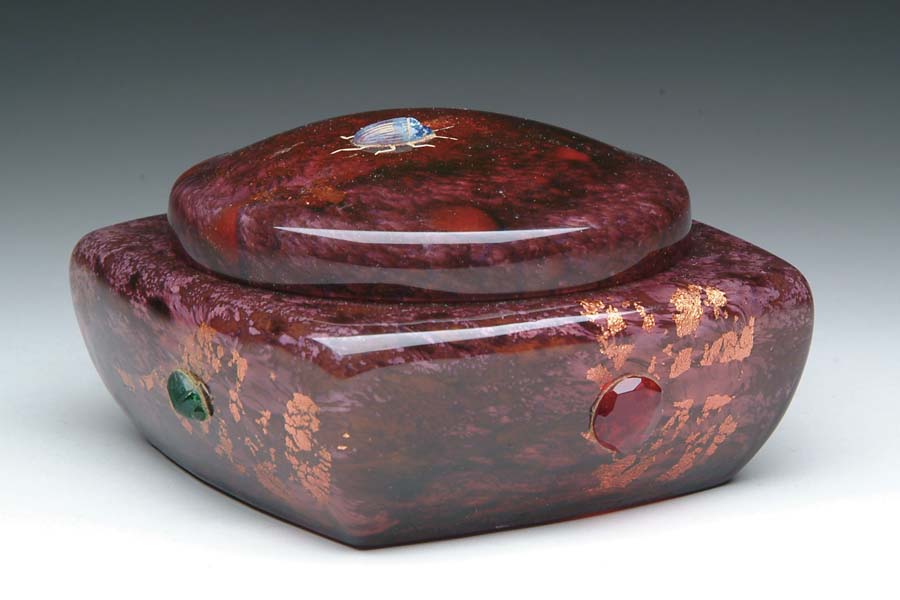 DAUM COVERED BOX. Spectacular Daum box is internally decorated with shades of purple as well as gold foil inclusions. Each side of the square box has an applied cabochon. Alternating sides have a blue and red faceted cabochon, the other two sides have a green and red ladybug cabochon with legs and feelers etched into the box side. The matching top has gold foil inclusions with a cabochon beetle set off to one side. Signed on the side with engraved signature “Daum Nancy France”. SIZE: 5-1/2 in. sq x 3 in. t. CONDITION: Very good to excellent. 5-61273 (1,200-1,500)