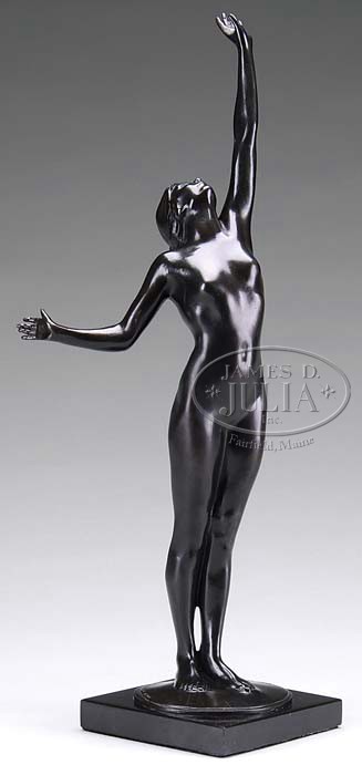 HARRIET WHITNEY FRISHMUTH (American, 1880 – 1980) “THE STAR”. Bronze sculpture modeled in 1918. The top edge of the base marked “Harriet W Frishmuth 1918 Gorham Co. Founders 0 505”. Dark brown to black finish. The bronze depicts a standing nude woman with left arm and hand reaching straight up with head gazing up with other hand and arm to the side. The bottom mounted to a square black marble base. Unknown edition. SIZE: Bronze: 18″ h. Overall: 19″ h. CONDITION: Very good to excellent. 9-98292 (6,000-9,000)