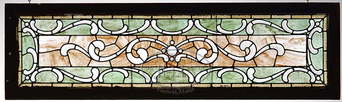 VICTORIAN LEADED STAINED GLASS TRANSOM WINDOW. Late 19th century. The center with S-scrolled clear beveled glass design, centering a large clear jewel within four conforming smaller jewels, all on a coffee marbleized leaded glass background. Framed with clear beveled glass C-scrolls, set within seaweed green leaded glass border panels. SIZE: 18″ overall h. x 62″ l. PROVENANCE: From an extensive private Gulf Coast collection. CONDITION: Retains original glass panels, slight bowing to ends, otherwise very good. 9-93543 (800-1,200)