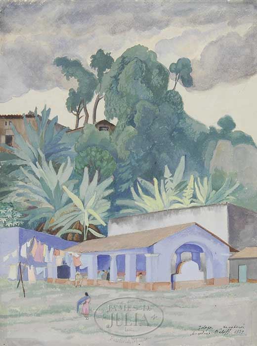 ANGELINA BELOFF (Russian, 1884-1969) “TALAPA LAVADEROS”. Watercolor scene shows a connected blue and white building under palm trees below a treed hillside with house under dark cloud sky. In foreground a woman is seen in red dress walking towards clothesline. Signed lower right, titled and dated “1939”. Unframed, corner mounted on a white matte board. SIZE: 20″ x 15″. CONDITION: Very good. 9-26015 (3,000-5,000)