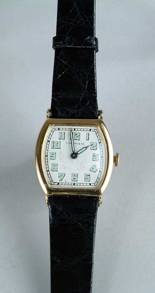 PETEK PHILIPPE AND CIE, GENEVE WRISTWATCH. Retailed and dial signed “Tiffany & Co. No. 194096, Case No. 2888830”. Produced in the 1930’s. Tonneau-shaped, 18kt yellow gold gentleman’s wristwatch. Back has inscription and dated “1933”. Case and movement signed, radium coated “skeleton” hands. 18 jewels. CONDITION: Runs when wound. Good. 9-99666 (5,000-6,000)
