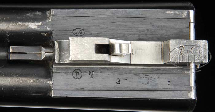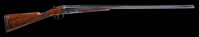 *RARE AND DESIRABLE PARKER BROTHERS DHE GRADE 32″ VENT RIB SIDE BY SIDE SHOTGUN. SN 216403. Cal. 20 ga. Listed in the Parker Gun Identification & Serialization book as a Grade T13. Built on an “O” frame with 32” Titanic Steel bbls choked FULL/IMP-MOD with Parker flat, matted, ventilated rib with dbl ivory beads, doll’s head rib extension, ejectors & dbl triggers. Mounted with nicely figured American walnut with checkered splinter forearm & straight stock with teardrop side panels, 14” over a Pachmayr pad. Receiver is engraved in typical “D” patterns of a pointer on left side, a setter on right side & four pheasants on floorplate, surrounded by foliate arabesque patterns & maker’s name in a ribbon on each side. Will letter as found. Bore diameter: left – .617, right – .616. Bore restrictions: left – .020, right – .018. Wall thickness: left – .034, right – .034. Drop at heel: 2-1/4”, drop at comb: 1-1/2”. Weight: 7 lbs. 4.16 oz. CONDITION: Extremely fine. Bbls retain 97-98% strong orig factory blue with slight muzzle edge wear & a small nick or two. Receiver retains 70-75% strong, bright, orig case colors, thin & fading to silver on right bottom edge, front of floorplate & left half of front of receiver. Sides are bright with brilliant colors in very sheltered areas. Wood is sound with light handling & use marks & retains about all of a professionally restored finish. Mechanics are crisp, brilliant shiny bores with a tiny ding in right bbl. 4-39796 (15,000-20,000)