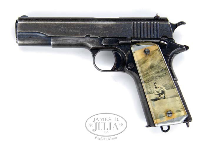 *VERY EARLY NAVY CONTRACT 1911 SEMI-AUTO MILITARY PISTOL. SN 10727. Cal. 45 ACP. Assembled pistol with 1912 Navy Contract frame & a later, post-1913, Army slide with flat top fixed rear sight & “1913” patent date on left side. Frame has “UNITED STATES PROPERTY” on front left side that has had “UNITED STATES” partially obliterated & it has the “WGP” (Maj. Walter G. Penfield) inspector initials above magazine release. Right side of frame has serial number in very small numbers above trigger. It has the long spur hammer & short spur grip safety with a checkered straight main spring housing. Mounted with GI made clear plastic, aluminum lined grips with photographs of a woman & baby on right side & a young man in military uniform on left side. Right side of slide has “MODEL OF 1911 U.S. ARMY” with the “U.S. ARMY” partially obliterated. Below slide marking at bottom edge on right side is electric penciled name “L.O. Hankins Paducah, Ky.” Consignor states that this was property of Capt. L.O. Hankins and connects him with the L.O. Hankins Hardware in Paducah, KY. Bbl is a later replacement with “COLT 45 AUTO” on lower left side and a “P” proof on left side of lug. Accompanied by an extremely rare “USN” in an oval “CLAYTON” 1911 holster with belt loop, missing leg strap. Back of belt loop is marked “XX1708”. Holster has been dyed black. Also accompanied by an early all blue lanyard loop magazine, probably refinished. CONDITION: Good. Slide retains 50-60% thin orig blue, stronger in sheltered areas. Frame retains about 30% thin orig blue with some fine pitting on front strap. Mechanics are fine, strong sharp bore with very fine pitting. Holster, polished black as noted, is dry & flexed in the flap with four small tears at rear edge and is overall very dry, in need of treatment. 4-35059 JR157 (1,250-1,750)