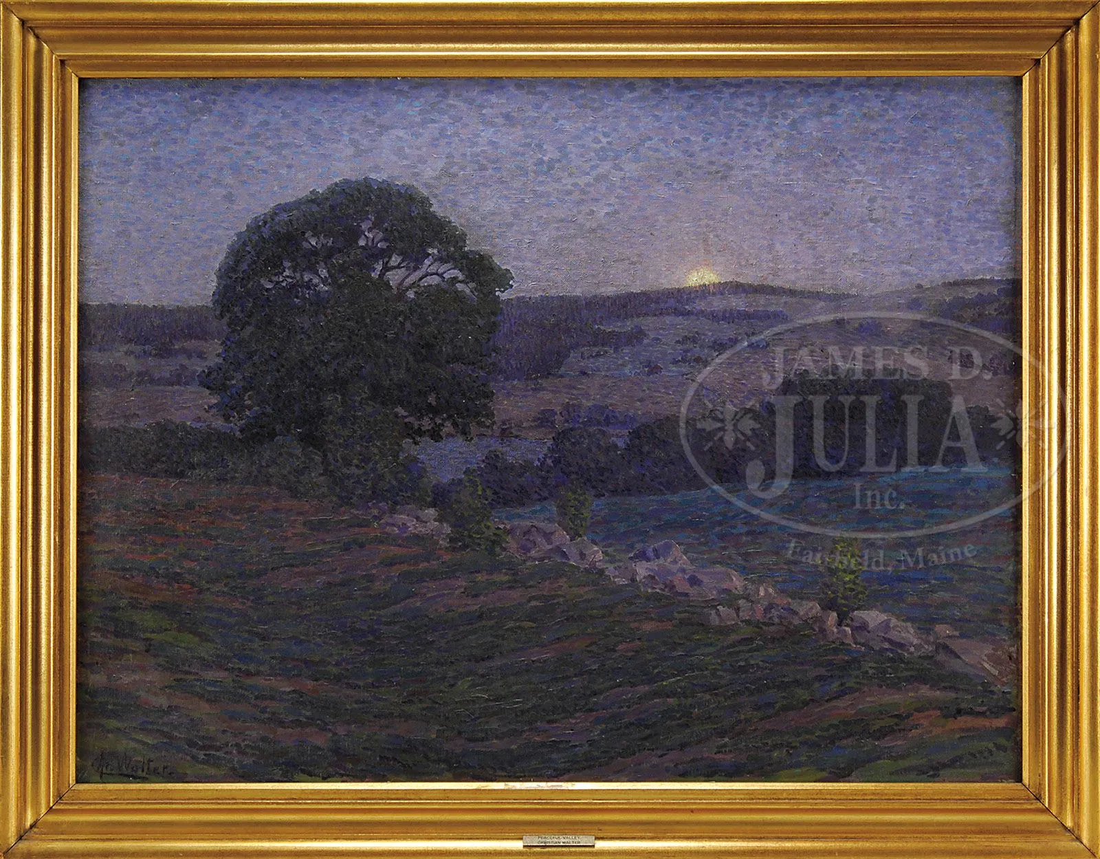 CHRISTIAN J. WALTER (American, 1872-1938) PEACEFUL VALLEY. Oil on canvas Housed in a molded wood gilt frame having title & artist plaque Signed lower left SIZE: 30″ x 40-1/4″ CONDITION: Very good, relined with minor inpainting 9-25592 (10,000-15,000)