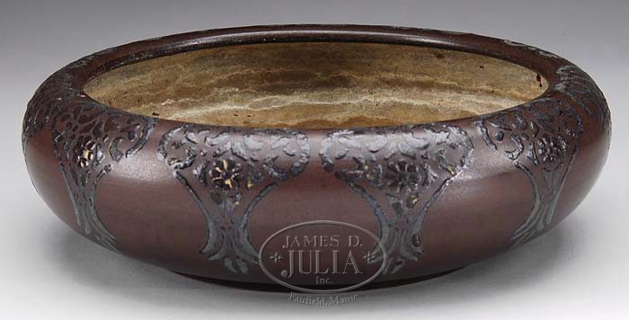 ARTS AND CRAFTS POTTERY BOWL. Nice arts and crafts bowl has rich brown glaze to the exterior with a stylized floral decoration descending from the lip. Inside of bowl is unglazed. Signed on the bottom “Lovatts Langley Ware, England”. SIZE: 10″ dia. CONDITION: Very good, with staining to the interior. 5-66855 (50-100)