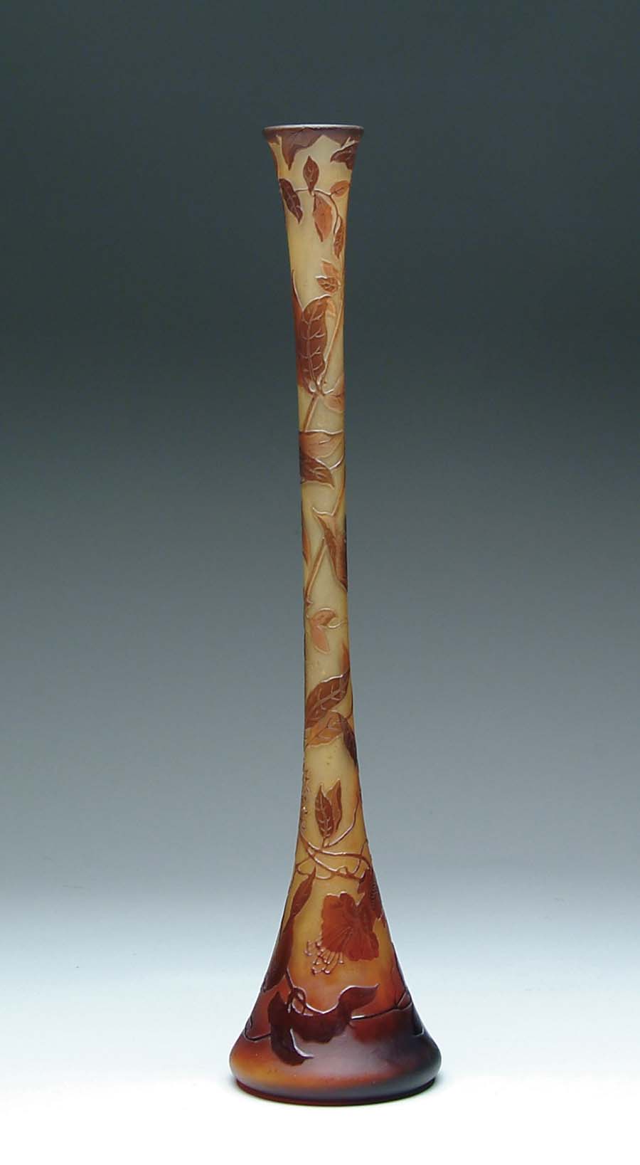 D’ARGENTAL CAMEO VASE. Tall slender D’Argental vase has beautiful translucent amber cameo leaves, vines and flowers against a frosted background shading from dark amber to light amber. Signed on the side in cameo “D’Argental St”. SIZE: 17 in. t. CONDITION: Very good to excellent. 5-61078 (1,000-1,500)