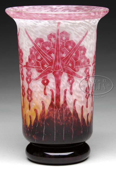 LE VERRE FRANCAIS FRENCH CAMEO VASE. Rhododendron Art Deco floral pattern in rouge is set against a heavily mottled white and pink background. The vase is finished in deep purple at the circular foot. Signed in script to top of foot “Le Verre Francais”. SIZE: 8-1/2″ t. CONDITION: Very good to excellent. 5-62721 (1,500-2,500)