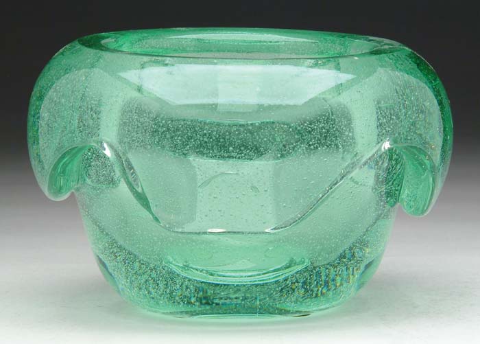 DAUM NANCY ART DECO VASE. Pale green colored glass with allover bubbles and folded down rim. Signed on the side of vase “Daum Nancy France”. SIZE: 5-1/4” t x 8-1/4” dia. CONDITION: Very good to excellent. 5-63755 (800-1,200)